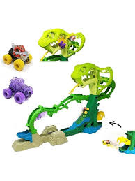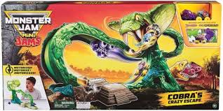 Monster Jam Mini Jams – Cobra’s Crazy Escape er et motoriseret legesæt med et slingrende jungle‑track, hvor du kan sende dine mini‑Monster Jam‑lastbiler igennem loop og udfordringer. Sættet indeholder to eksklusive Mini Jams-biler: ThunderROARus og JCB Digatron, begge med unikt “gem”-tema design. Du kan løfte et skjult dørhåndtag for at lade bilerne flygte gennem en sideudgang, og der er plads til at opbevare op til seks mini-biler i legehavnen. Spillet fremmer kreativ leg og actionfyldte stunts og anbefales til børn fra ca. 3 år. Batterier (ikke inkluderet) kræves for at aktivere motoren.