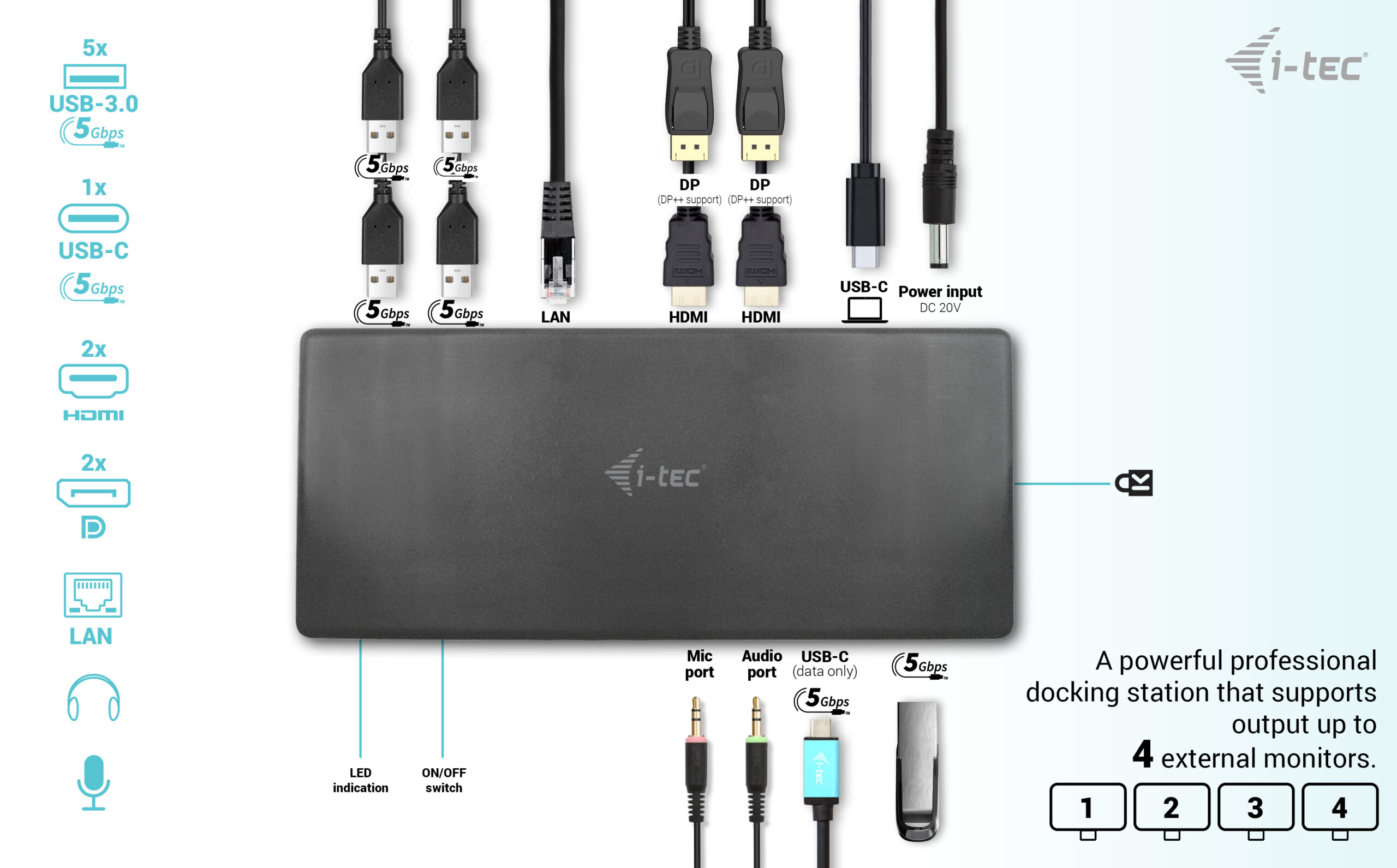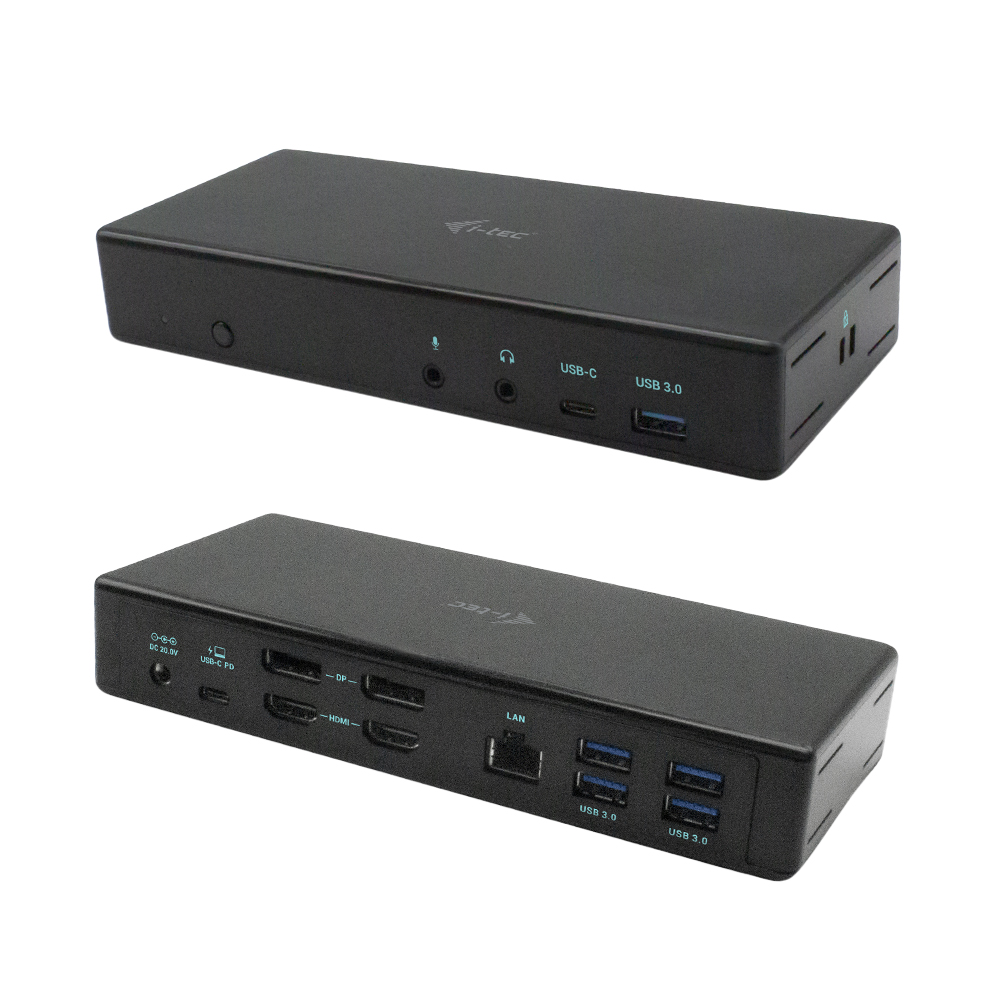 i-tec USB-C Quattro Display Docking Station with Power Delivery 85 WProfessional USB-C docking station with support for up to four external monitors. The docking station is equipped with hybrid image processing: it is built on DisplayLink and USB-C video transmission technologies, allowing it to process images on four display devices at the same time. The station is compatible with any laptop equipped with a USB-C port (with video transmission support) or Thunderbolt 3. 6x USB ports, reliable and quick connection to your company network thanks to an integrated LAN port and support for installation on the back of a monitor make the docking station an ideal partner for professionals. And of course, the station is capable of charging your laptop or tablet with up to 85 W. Connect up to 4 external monitors Power delivery: up to 85 W Provides 2 DisplayPorts and 2 HDMI ports 5x USB 3.0 and 1x USB-C ports will allow you to easily connect your USB devices and peripherals. Gigabit Ether