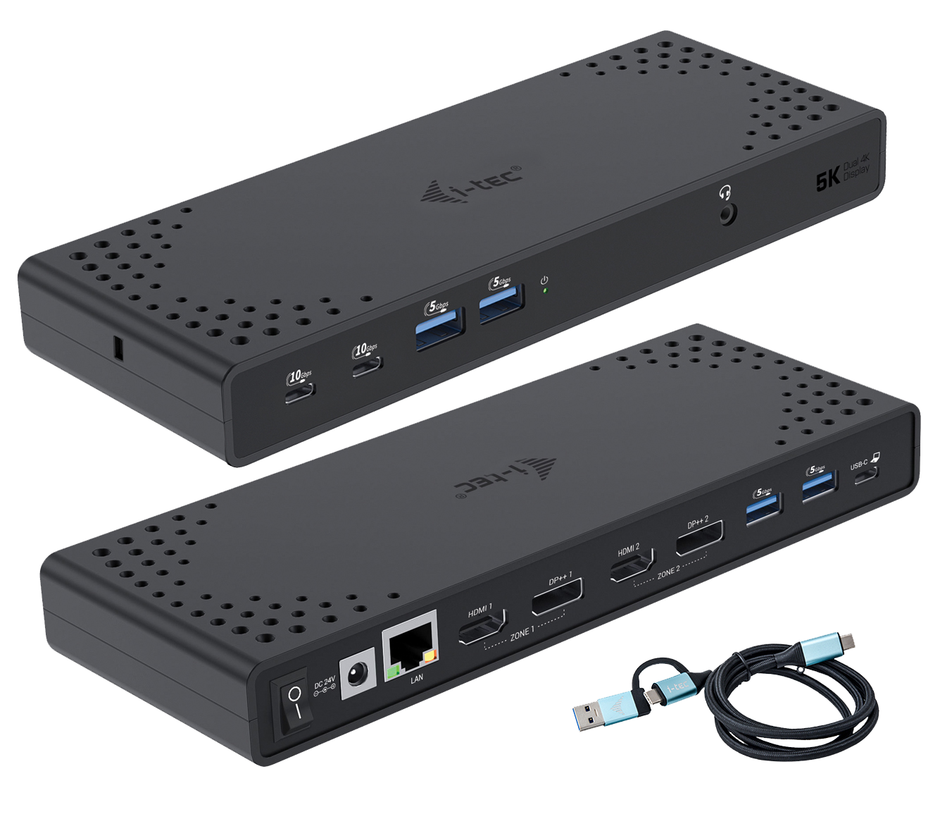 i-tec USB 3.0 / USB-C / Thunderbolt 3 Dual Display Docking Station Gen2 + Power Delivery 100W Universal docking station compatible with laptops and tablets with USB-C, USB-A, and Thunderbolt interfaces. 2x DisplayPort and 2x HDMI supporting up to two 4K/60Hz displays (also applicable for Apple M1/M2 platform) or one 5K/60Hz display. 6x USB ports including 4x USB-A 3.0 (1x fast charging BC 1.2) and 2x USB-C Gen2 (10 Gb/s), facilitating the connection of multiple USB devices and peripherals for super-fast data transfer. Provides up to 100W Power Delivery for compatible laptops and tablets with USB-C and Thunderbolt interfaces. The host device must support USB-C Power Delivery. GLAN Ethernet supports network speeds of 10/100/1000 Mb/s, providing robust and high-speed internet connectivity. Separate 3.5mm audio input and output connectors for easy connection of headsets or speakers. Includes a VESA mount to help keep your desk organized and eliminate cab