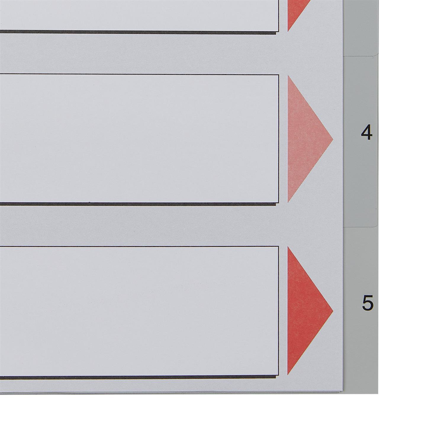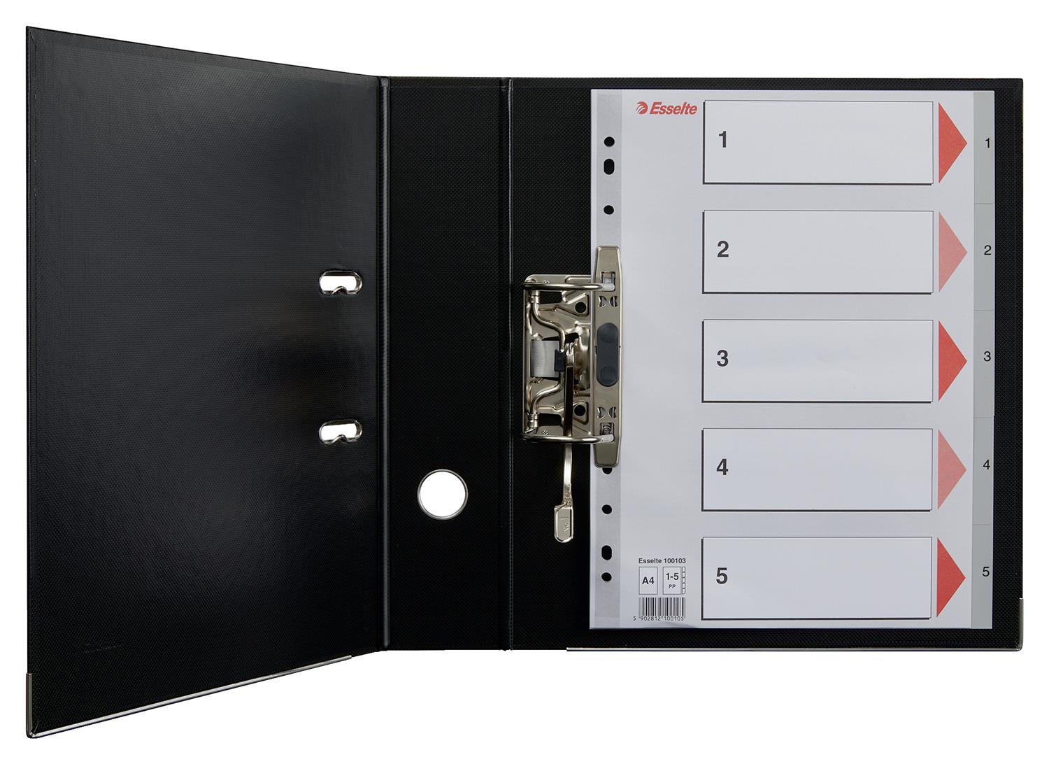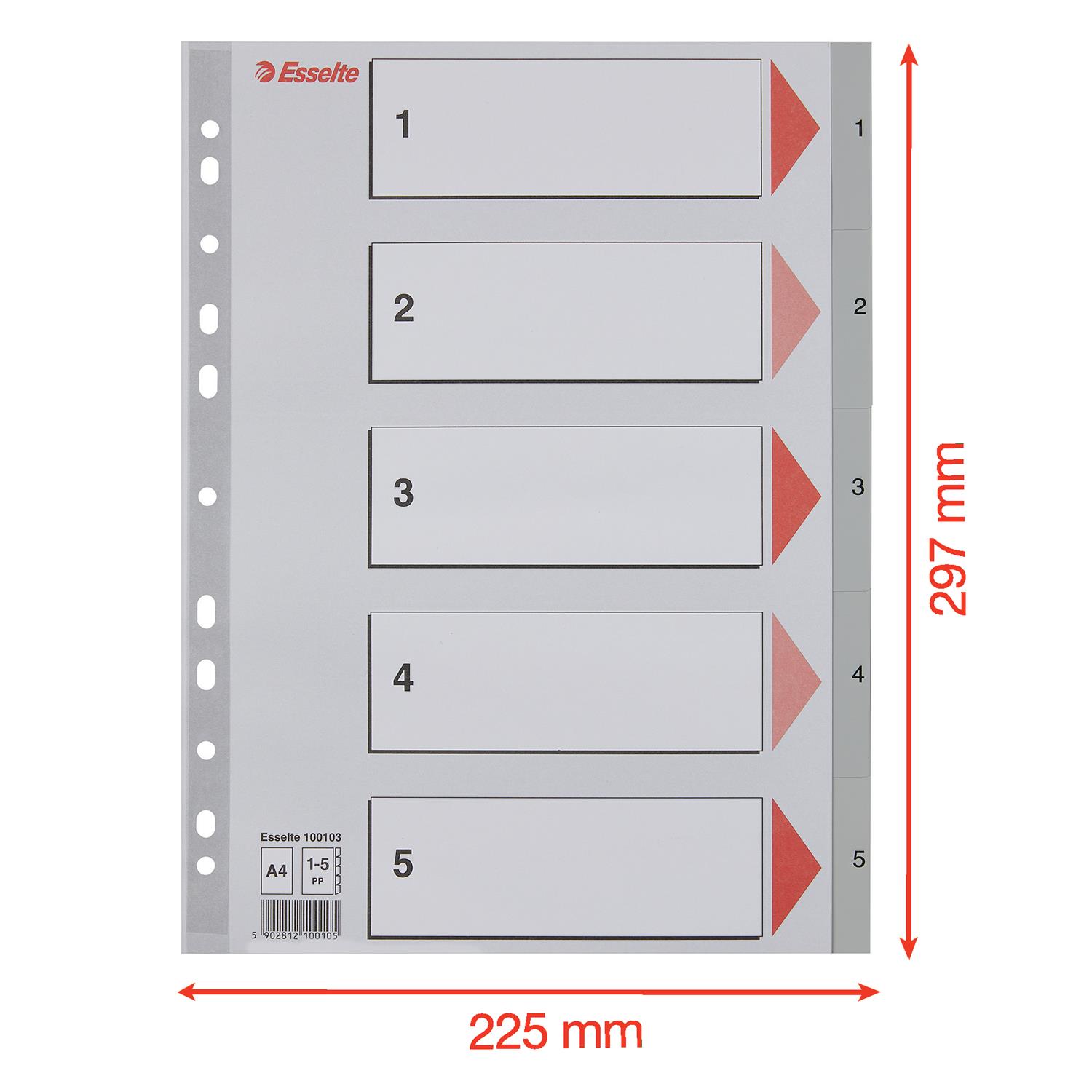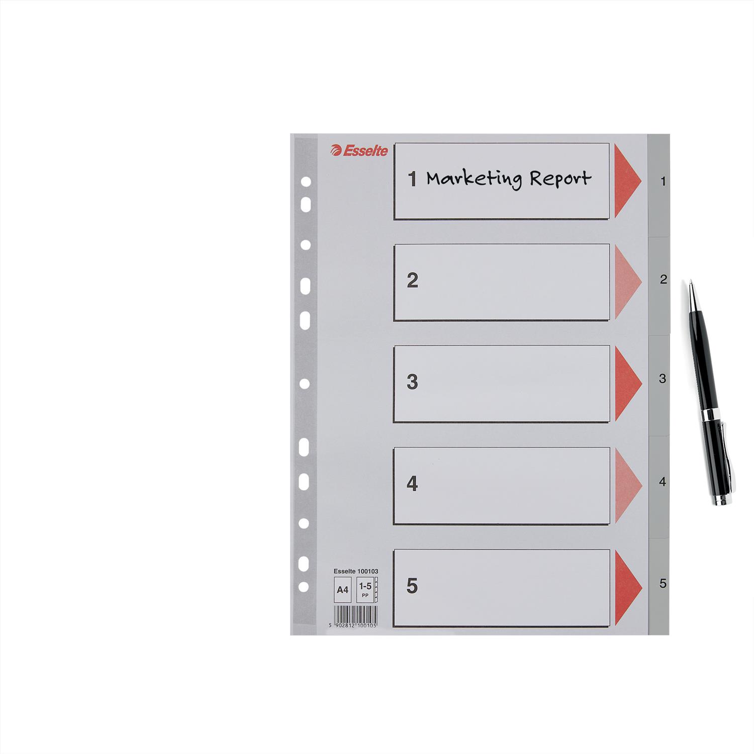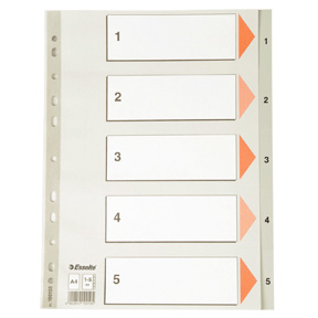 Kraftig PP-folie A4 med pile-design. Indhold 1-5. Forstærket forblad. Hvert sæt leveres i PP pose. Front ark 130 g stærk, hvid karton med plast-forstærkede huller