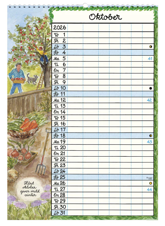 • Hver måned vises på sin egen side (34 x 48 cm), opdelt i syv kolonner – ét felt per person pr. dag