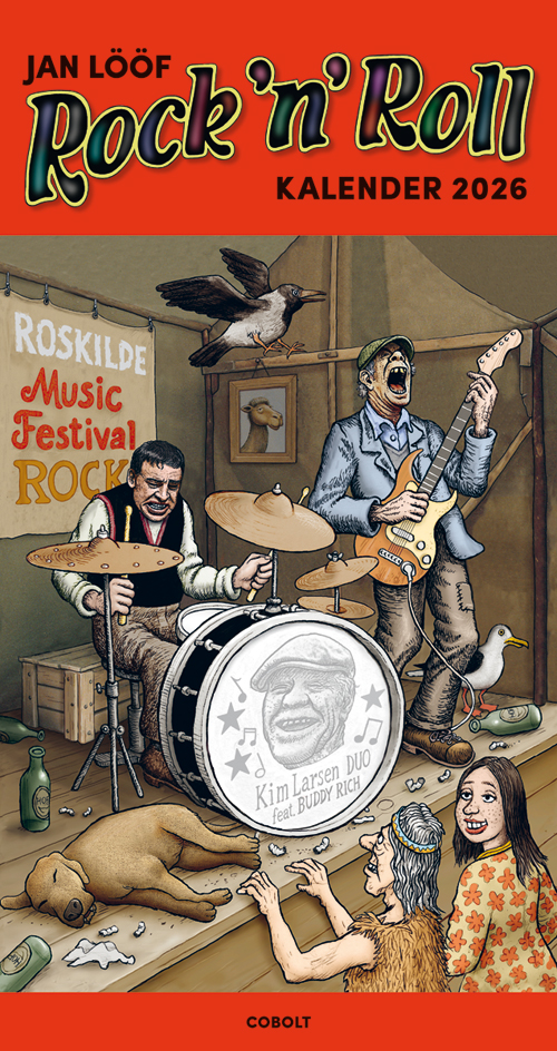 Årets mest iøjnefaldende vægkalender i ekstra stort format – en halv meter høj – med tolv mageløse portrætter af klassiske rockmusikere tegnet af den legendariske svenske illustrator, forfatter og tegneserieskaber Jan Lööf.