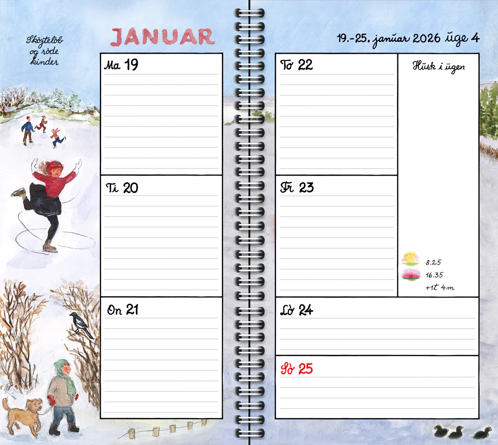 • 128 sider med illustreret ugeoversigt samt årsoverblik, telefonliste og arbejdsskemaer