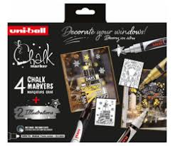 Uni Chalk Marker PWE‑5M 4‑pc Xmas Set er et sæt flydende kridtpenne der giver stærke, dækkende farver — perfekt til tavler, vinduer, glas, spejle og andre glatte overflader. Markørerne tørrer hurtigt, er vandbaserede og kan nemt tørres af igen med en våd klud, hvilket gør dem ideelle til både midlertidige skilte, dekorationer og kreative projekter. Den medfølgende stencils og de klassiske farver (guld, sølv, hvid, sort) gør det nemt at lave dekorative designs, menuer eller festlige budskaber — og samtidig uden kridtdust. Uni Chalk Marker PWE‑5M 4‑pc Xmas Set er derfor oplagt til caféer, butikker, juledekorationer eller kreativ hjemmeindretning, hvor du ønsker synlige og elegante budskaber med minimal rengøring.