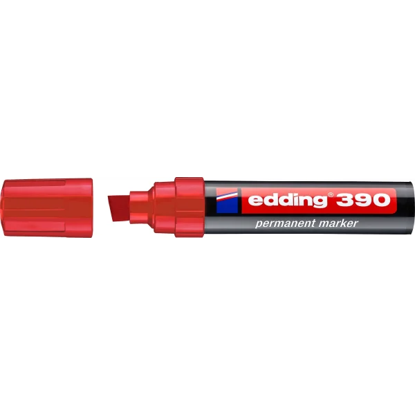 Med Edding 390 får du her en Rød marker med en ekstra bred skrå spids, som har en stregbredde på 4-12 mm, der giver mulighed for brede og store markeringer.
