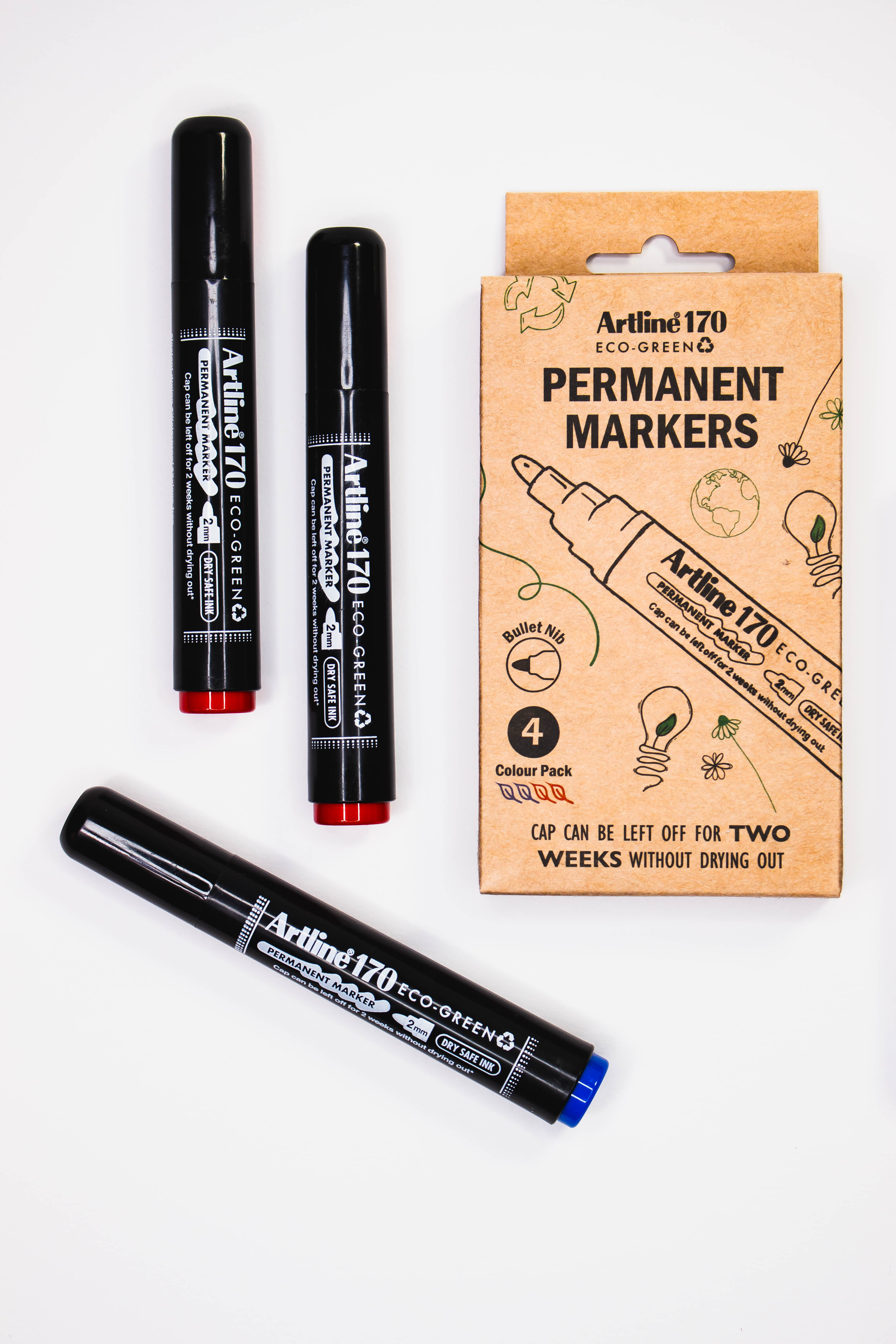 Artline ECO-GREEN permanent marker Artline EK-170 2.0mm Bullet Tip Dry Safe Permanent Markers are specially designed for indoor/outdoor use and are ideal for construction and industrial applications, as well as arts and crafts projects. Long-lasting drawing is assured with the permanent fast dry and waterproof alcohol-based solvent ink, leaving an opaque water- and fade-resistant mark on nearly any surface, including glass, metal, plastic, porcelain, and wood, The dry-safe technology keeps the pen from drying out even without their cap for up to 2 weeks!  Made from post consumer recycled plastic Certified by Eco Mark