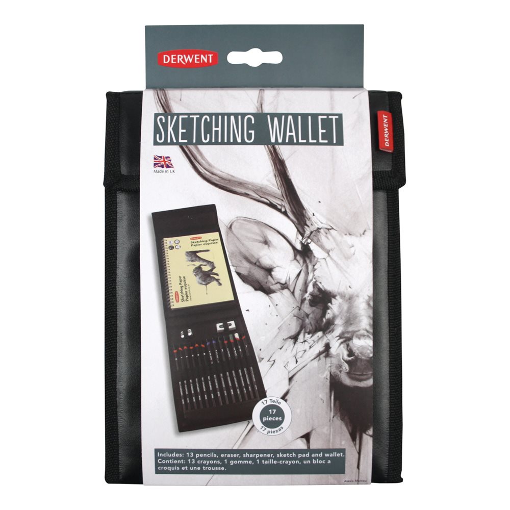 Derwent sketching wallet indeholder 6 skitse blyanter i hårdhed 2H, H, B, 2B, 4B, 6B, 2 vandopløselige skitseblyanter 4B-8B, 1 onyx blyant, mørk, 3 tonede kulblyanter, 1 kulblyant, 1 metal spidser, 1 viskelæder og 1 A5 tegneblok