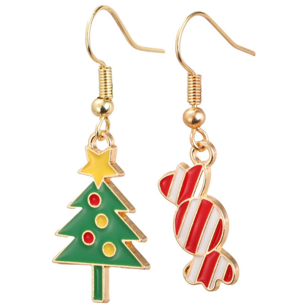 Flotte juleøreringe, som forestiller et juletræ og en karamel.