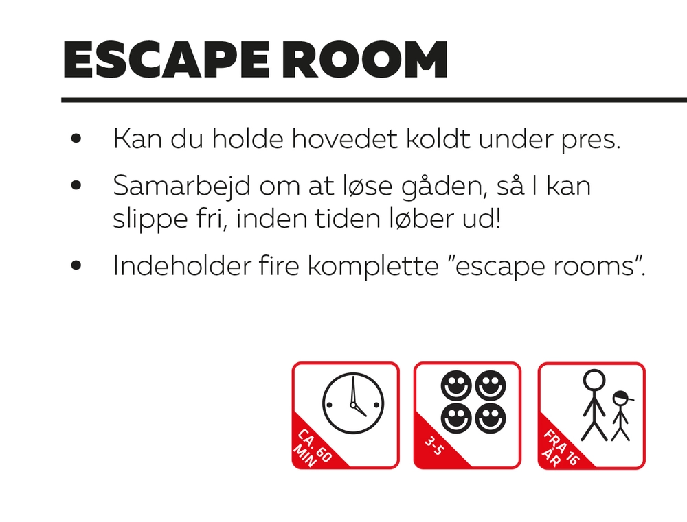 I dette udfordrende og uforudsigelige spil er I nødt at arbejde sammen for at løse gåder og finde skjulte ledetråde. Spillet svarer til et rigtig escape room, men hjemme i din stue.
