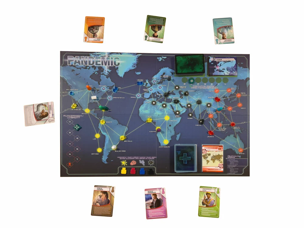 I pandemi er flere virulente sygdomme brudt ud samtidigt over hele verden! Spillerne er specialister inden for sygdomsbekæmpelse, hvis mission er at behandle sygdomshotspots, mens de undersøger helbredelser for hver af de fire plager, inden de går ud af kontrol. Spilbrættet viser flere store befolkningscentre på jorden. På hver tur kan en spiller bruge op til fire handlinger til at rejse mellem byer, behandle inficerede befolkninger, opdage en kur eller opbygge en forskningsstation. Et kort kort giver spillerne disse evner, men strøet gennem dette spil er Epidemic! -Kort, der fremskynder og intensiverer sygdommens aktivitet. Et andet, separat kortdæk styrer infektionens “normale” spredning. Spillerne tager en unik rolle inden for holdet, og de skal planlægge deres strategi for at indgå i deres specialisters styrker for at erobre sygdommene. For eksempel kan driftseksperten bygge forskningsstationer, der er nødvendige for at finde kur mod sygdommene, og som muliggør større mobilitet mellem byer; Forskeren har kun brug for fire kort af en bestemt sygdom for at helbrede den i stedet for de normale fem - men sygdommene spredes hurtigt, og tiden løber ud.. Hvis de helbreder de fire sygdomme, vinder de alle!