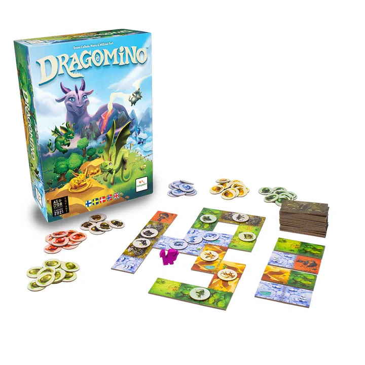 Dragomino skal I udforske øen og finde dominobrikker, til jeres egne områder. Hvis du ligger en brik så 2 ens felter rører hinanden har du fundet et æg! Men ikke alle æg indeholder babydrager, nogle er bare tomme skaller. Den dragetræner der har fundet flest babydrager når spillet er slut har vundet.