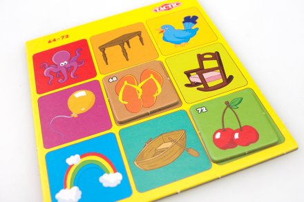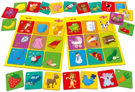 Vend brikken om og prøv at finde den på dit Lotto-bræt. Den spiller der først danner en række med fem symboler på deres eget Lotto-bræt, vinder spillet!