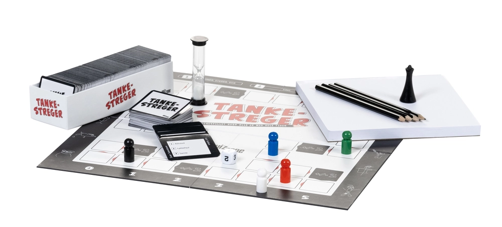 Æsken indeholder; Spilleplade, 500 kort med 2500 opgaver, blok, blyanter, brikker, terning og timeglas.