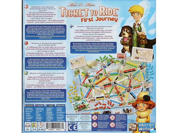 Spillet er super nemt at lære, så selv de yngste spillere kan være med (anbefales fra 6 år). Du skal samle de rigtige togvogne og bruge dem til at gøre krav på ruter mellem byerne på dine billetter. Den første spiller, der fuldfører seks billetter, vinder spillet! Ticket to Ride - First Journey er perfekt til en hyggelig eftermiddag derhjemme, en sjov aktivitet på rejsen, eller som en introduktion til brætspilsverdenen.