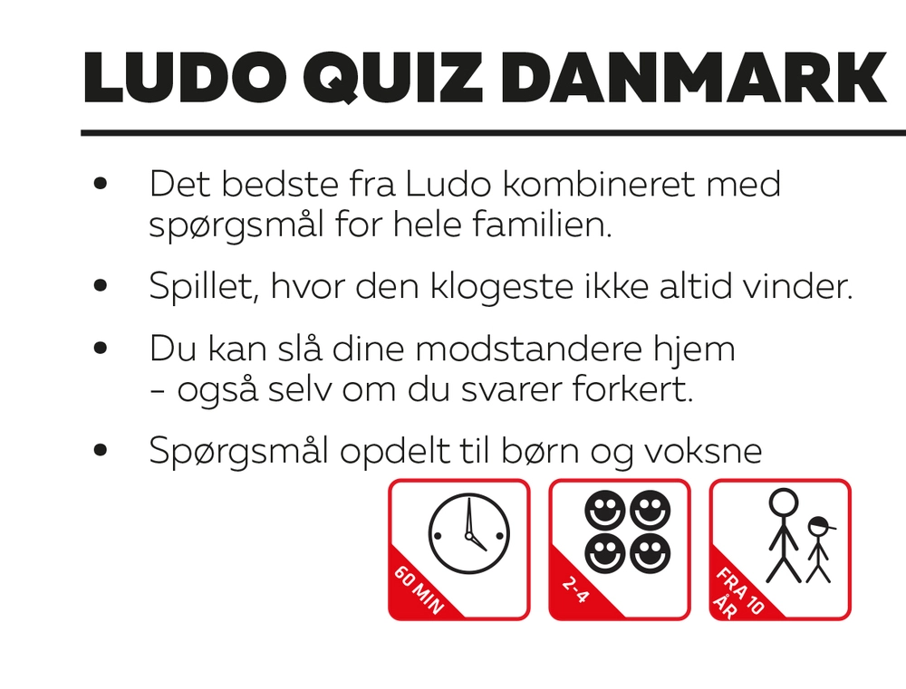 Kombiner det klassiske Ludo-spil med en sjov quiz om Danmark! Dette spil byder på over 1.200 spørgsmål — både til børn og voksne — og skaber masser af underholdning for hele familien.