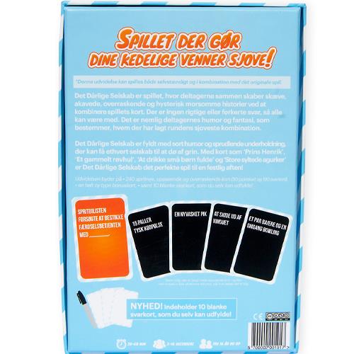 Udvidelsen giver dig mulighed for at spille "Det Dårlige Selskab" igen og igen uden at løbe tør for nye og overraskende kombinationer. Det er den perfekte måde at holde spillet friskt og spændende, selv efter mange timers spil. Og husk: jo flere kort, jo flere muligheder for at slippe din indre provokatør løs og skabe en aften fyldt med uforglemmelige (og måske lidt pinlige) minder.