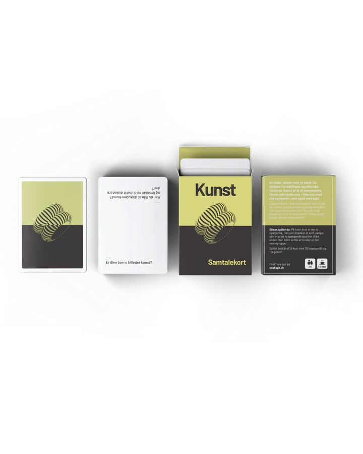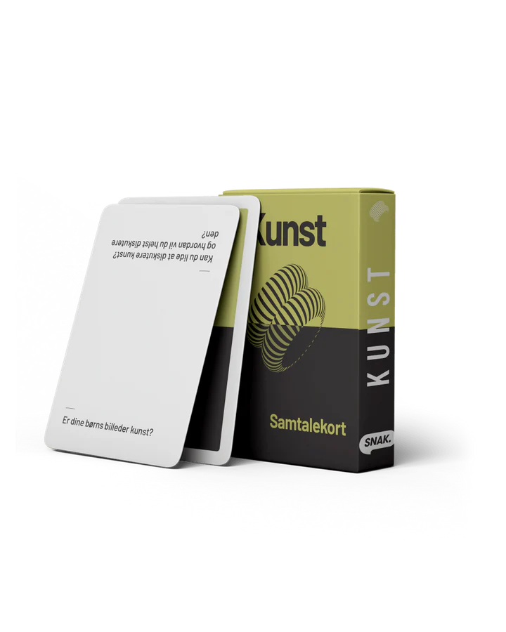 Med disse samtale kort om kunst får du et redskab med 55 kort. Disse kort er gode til at åbne samtalen og få en god snak om kunst. Disse kort kan samle familier og vennegrupper. Man kan få en god snak om hvad man syntes om kunst, hvad kunst man bedst kan lide og hvad dit personlige forhold er til kunst.