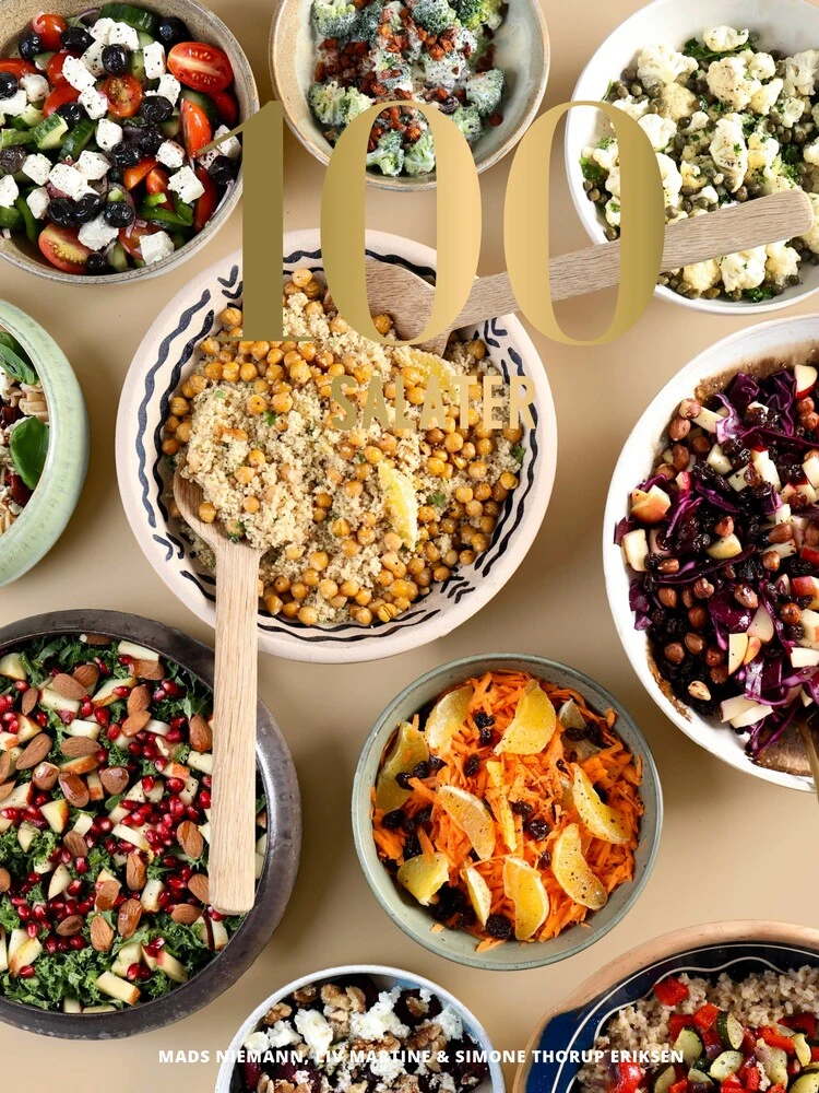 Grønkål med granatæble og citron, jordbær med spinat og balsamico-honning, couscous med kikærter og kanel-appelsin, røget ørred med agurk og peberrod, fersken med burrata og prosciutto – er bare 5 af bogens 100 salater.