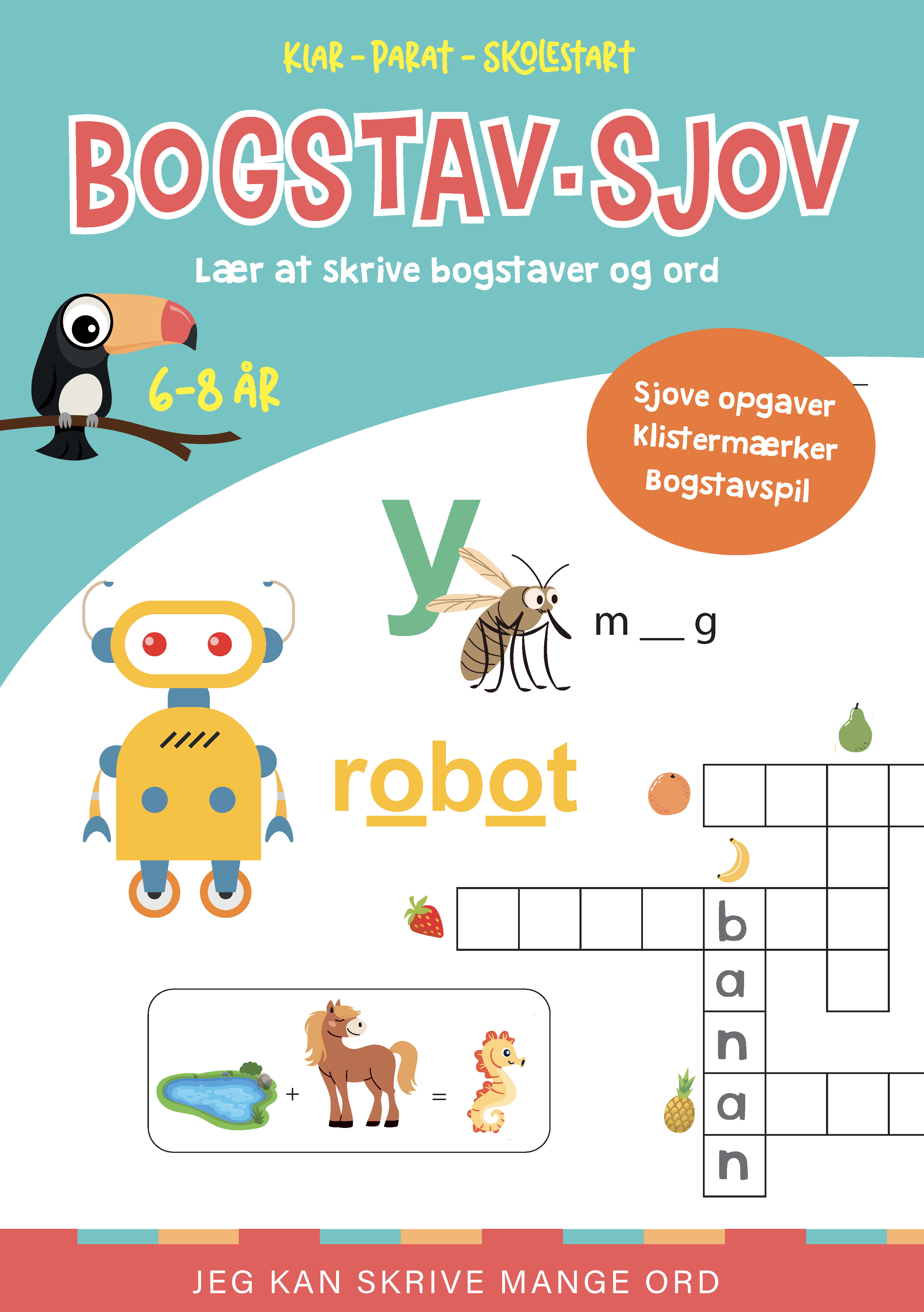 Opgavebogen er fyldt med hyggelige opgaver med klistermærker: rim, krydsord, labyrinter og meget, meget mere- og bagest i bogen kan du desuden finde et sjovt bogstav-spil.