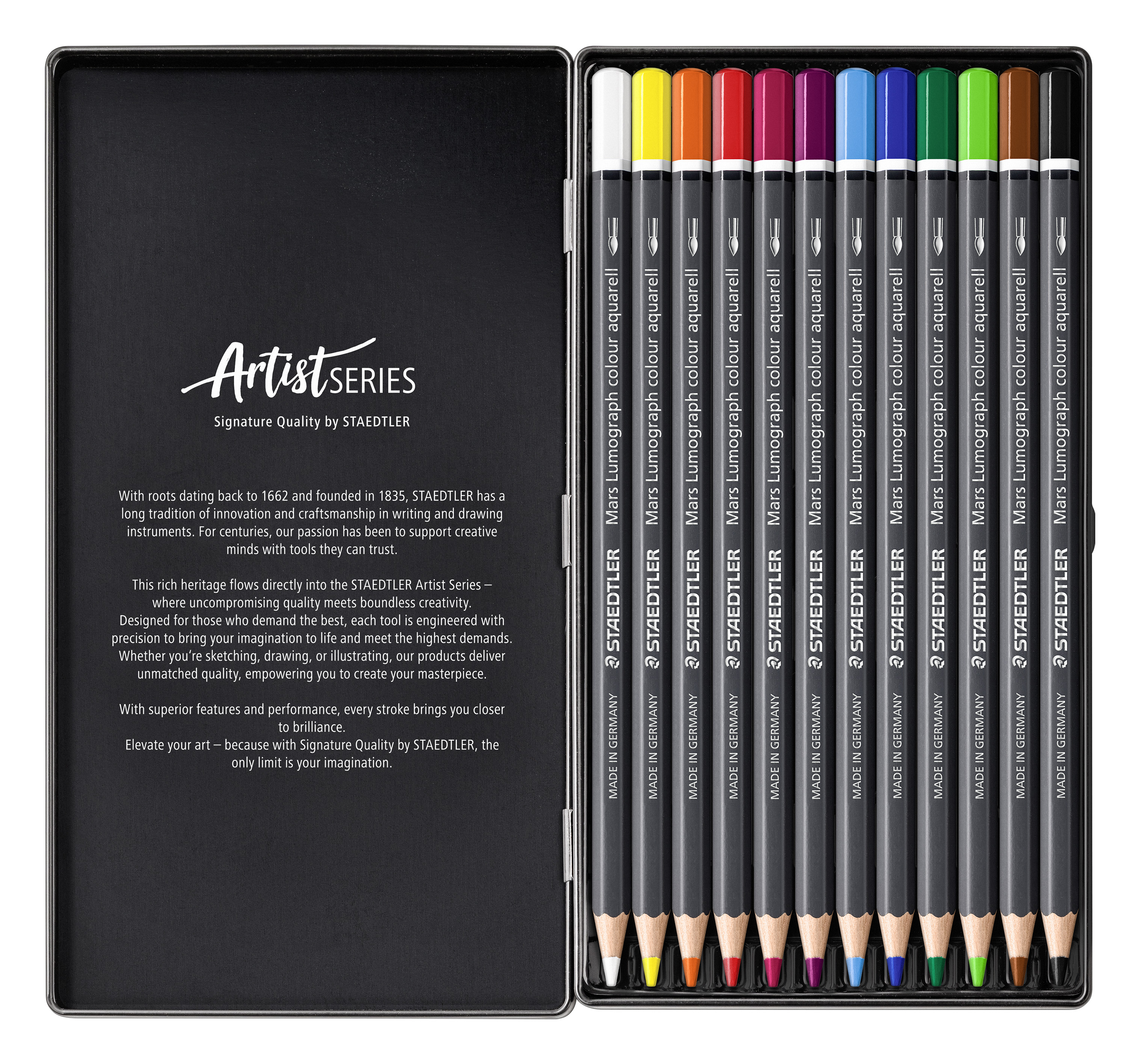 Mars® Lumograph® akvarelfarveblyant • Højkvalitets akvarelfarveblyant i klassisk sekskantet form med akvarelmine • Den bløde streg giver både jævne overgange og stærke farver • Fuldt vandopløselig for at frigøre farvernes fulde styrke • Høj pigmentering for fremragende lysægthed og dækkeevne • Muliggør et bredt udvalg af maleteknikker og kombinationsmuligheder (mixed media) • Løse blyanter fås i 120 fint afstemte, ensartede farver • Tykkere stift med en diameter på 3,6 mm • Fremstillet af træ fra PEFC-certificerede, bæredygtigt forvaltede skove Metalæske med 12 farveblyanter i assorterede farver