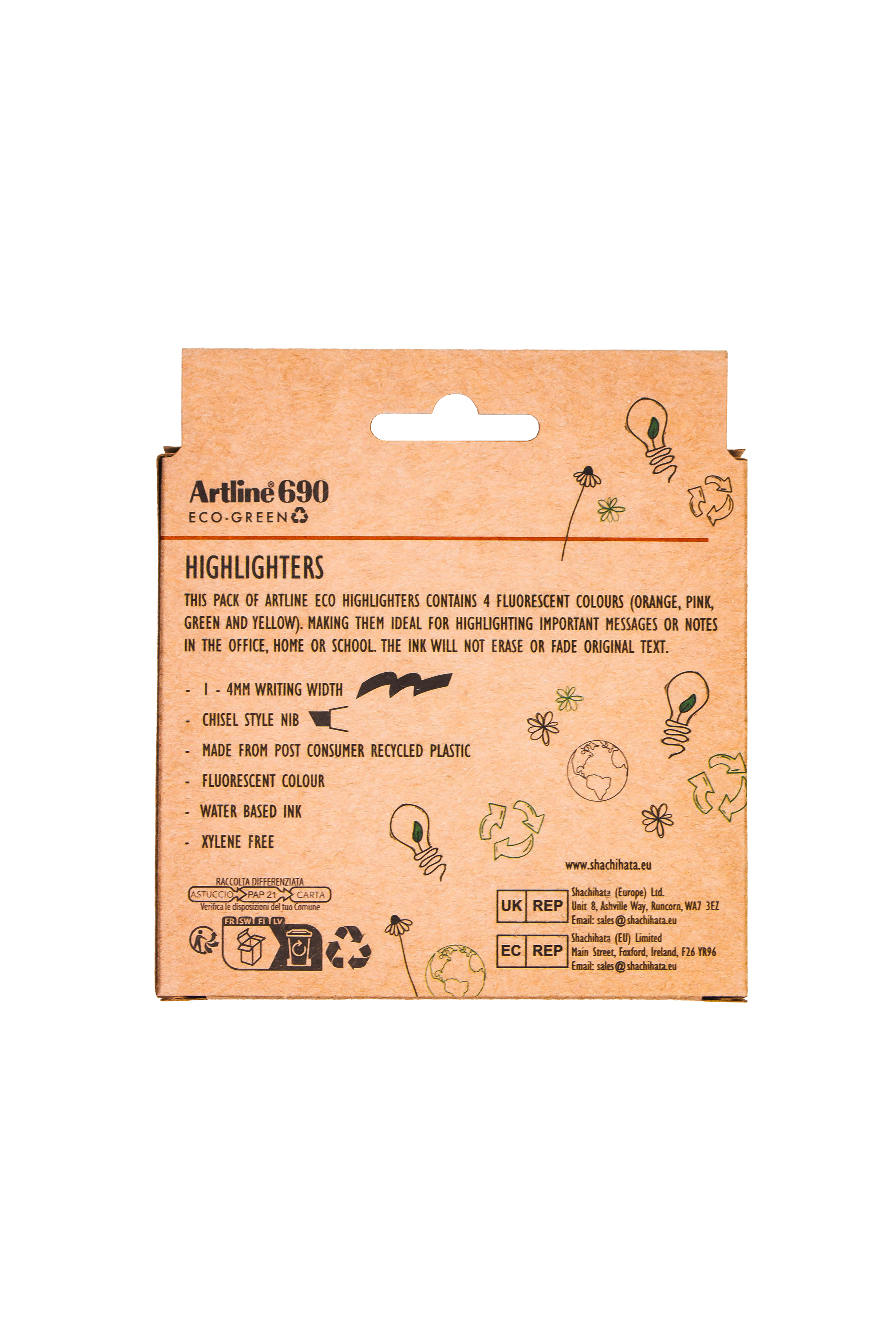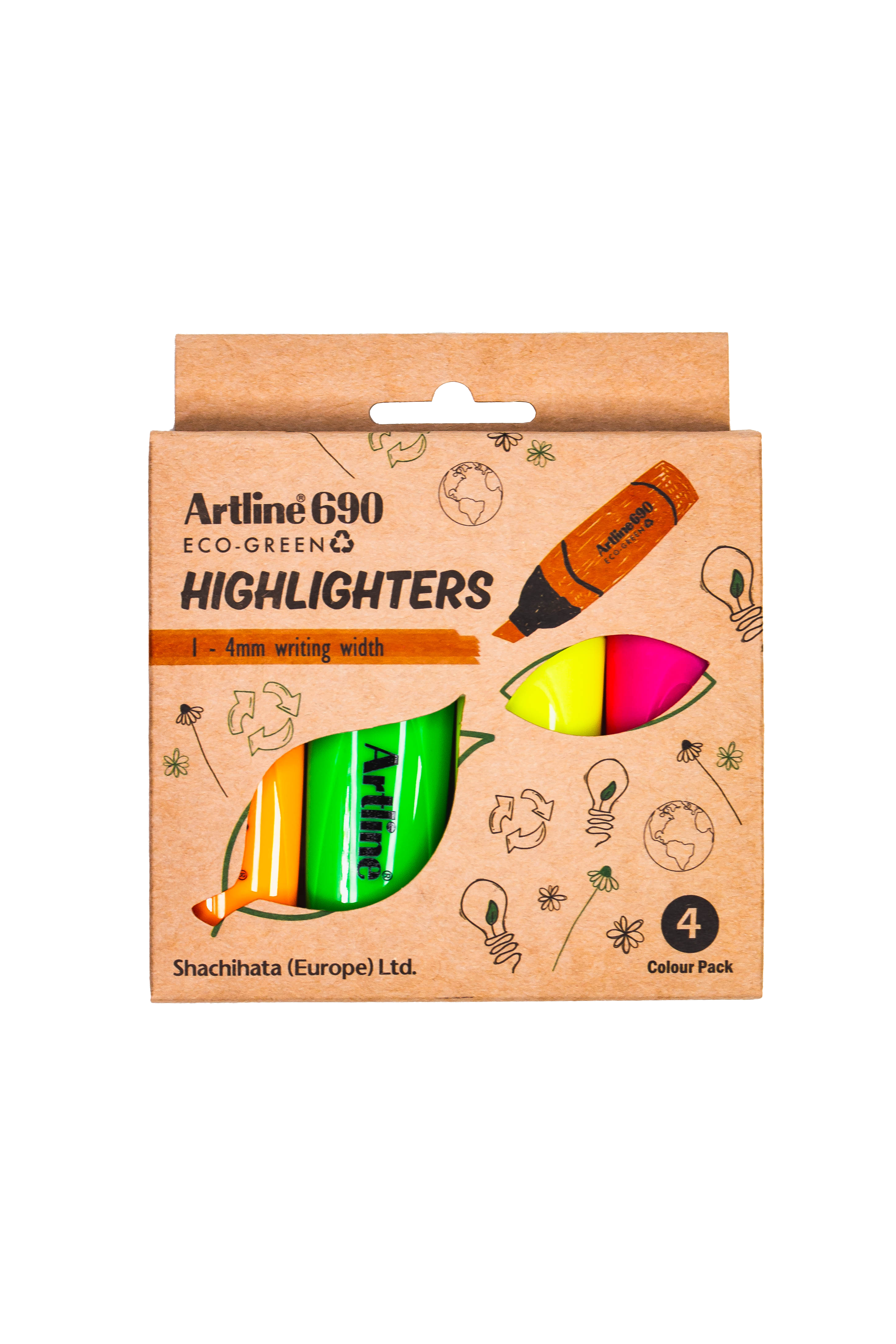 Artline ECO-GREEN Highlighter -Ergonomic grip for comfortable, extended use -Ideal for highlighting text or creative projects -Available in 5 Vibrant colours to suit your style Made from post consumer recycled plasticCertified by Eco Mark