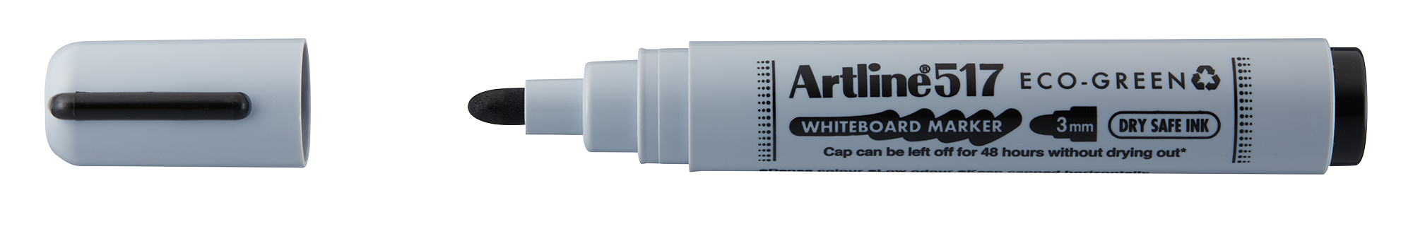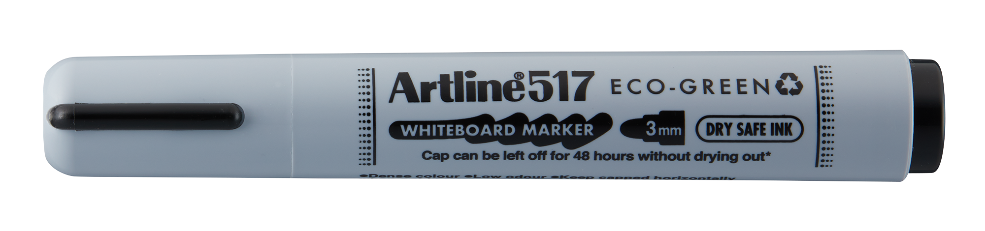 Artline ECO-GREEN whiteboard marker Artline EK-517 2.0mm Bullet Tip Dry-Safe Whiteboard Markers are convenient to use for a long period of time without replacing the cap. It has 48 hours of "cap-off" time and still delivers bright colors. Also suitable for use on electronic whiteboards. It's fast-drying and xylene-free. Recommended use: glass, porcelain, and whiteboard. Made from post consumer recycled plastic Certified by Eco Mark