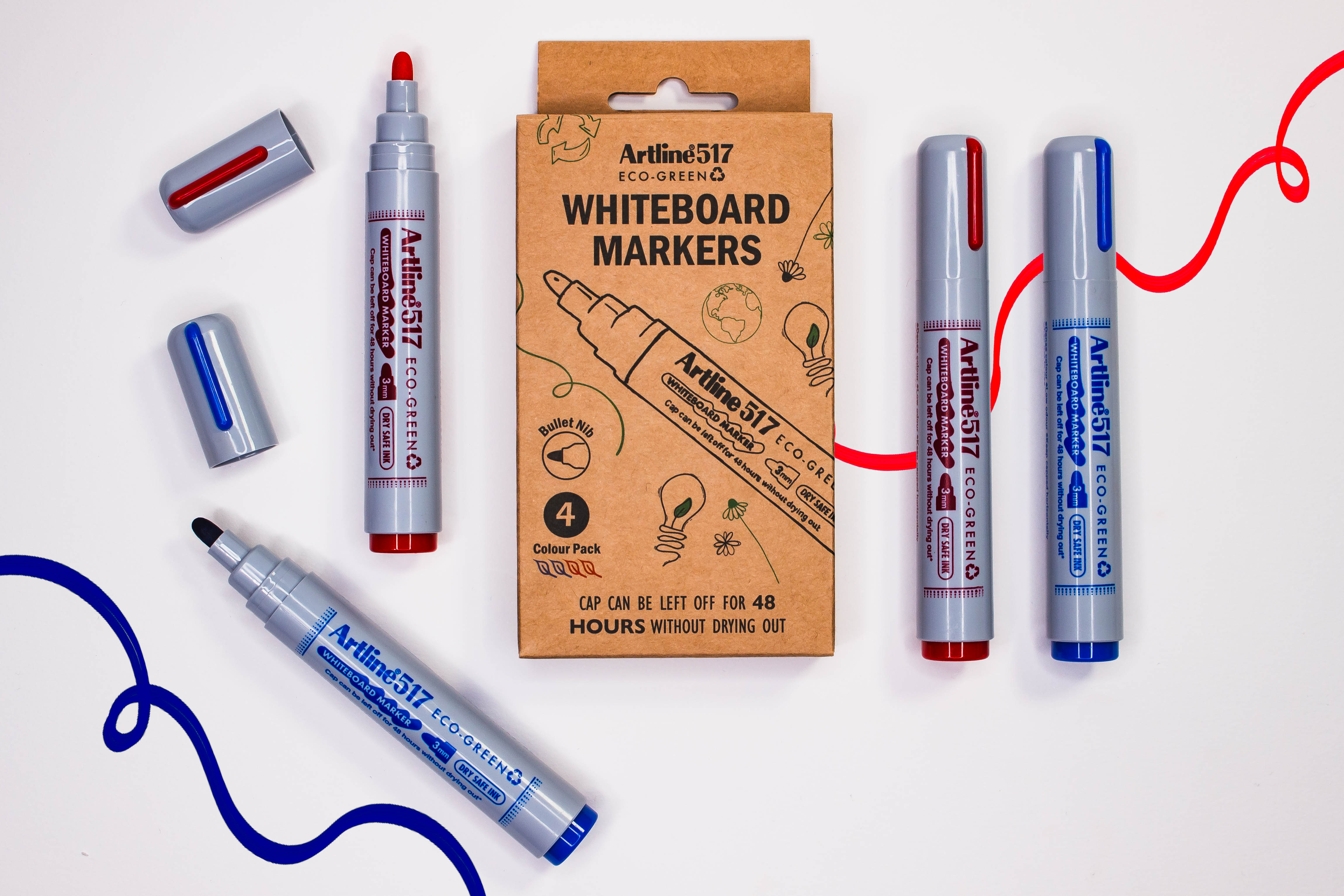 Artline ECO-GREEN whiteboard marker Artline EK-517 2.0mm Bullet Tip Dry-Safe Whiteboard Markers are convenient to use for a long period of time without replacing the cap. It has 48 hours of "cap-off" time and still delivers bright colors. Also suitable for use on electronic whiteboards. It's fast-drying and xylene-free. Recommended use: glass, porcelain, and whiteboard. Made from post consumer recycled plastic Certified by Eco Mark
