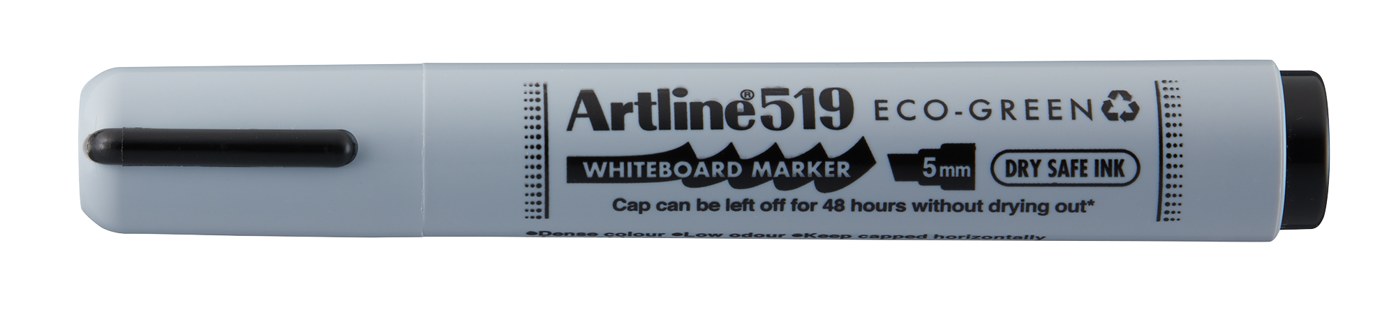 Artline ECO-GREEN whiteboard marker Artline EK-519 2.0-5.0mm Chisel Tip Dry-Safe Whiteboard Markers are convenient to use for a long period of time without replacing the cap. It has 48 hours of "cap-off" time and still delivers bright colors. Also suitable for use on electronic whiteboards. It's fast-drying and xylene-free. Recommended use: glass, porcelain, and whiteboard. Made from post consumer recycled plastic Certified by Eco Mark