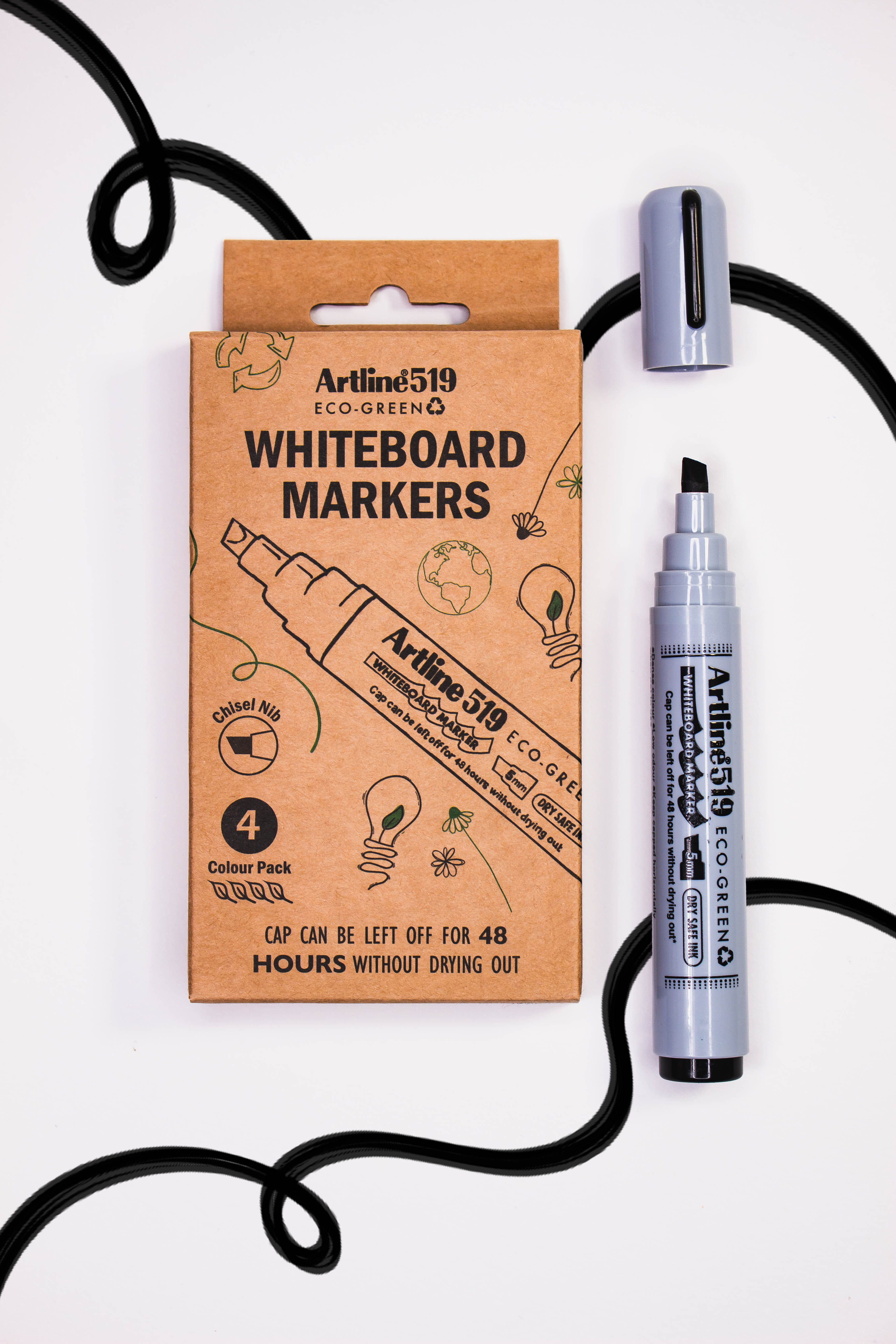 Artline ECO-GREEN whiteboard marker Artline EK-519 2.0-5.0mm Chisel Tip Dry-Safe Whiteboard Markers are convenient to use for a long period of time without replacing the cap. It has 48 hours of "cap-off" time and still delivers bright colors. Also suitable for use on electronic whiteboards. It's fast-drying and xylene-free. Recommended use: glass, porcelain, and whiteboard. Made from post consumer recycled plastic Certified by Eco Mark