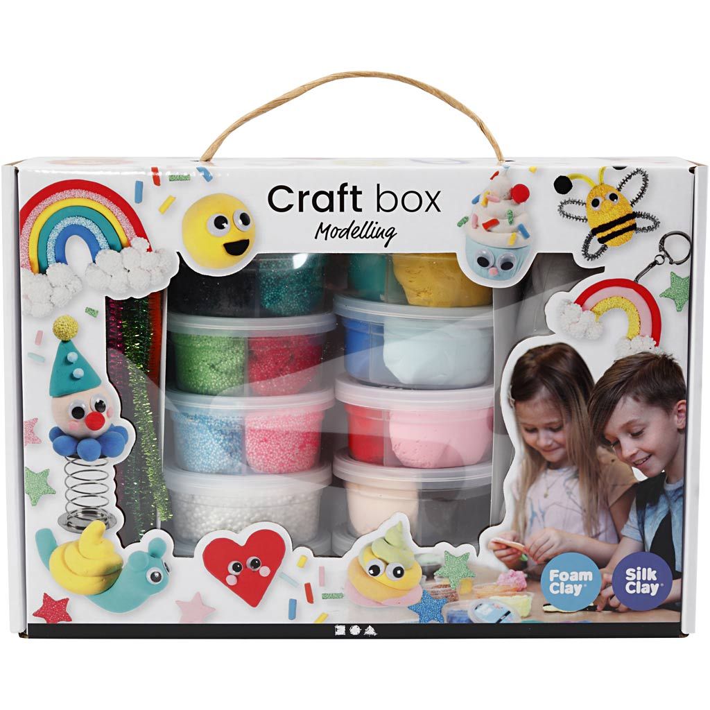 Sættet indeholder bl.a.: Silk Clay, Foam Clay, Foam Clay glitter, kagerulle, udstiksforme, modellerpinde, hjerte, kugler, æg, træpinde, ispinde, selvklæbende rulleøjne, fjeder og nøgleringe.
