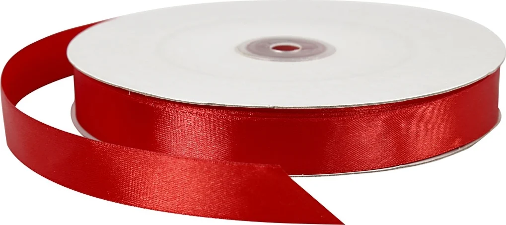 Med dette satinbånd i rød, får du et bånd som er 20 mm bred og 100 m langt.