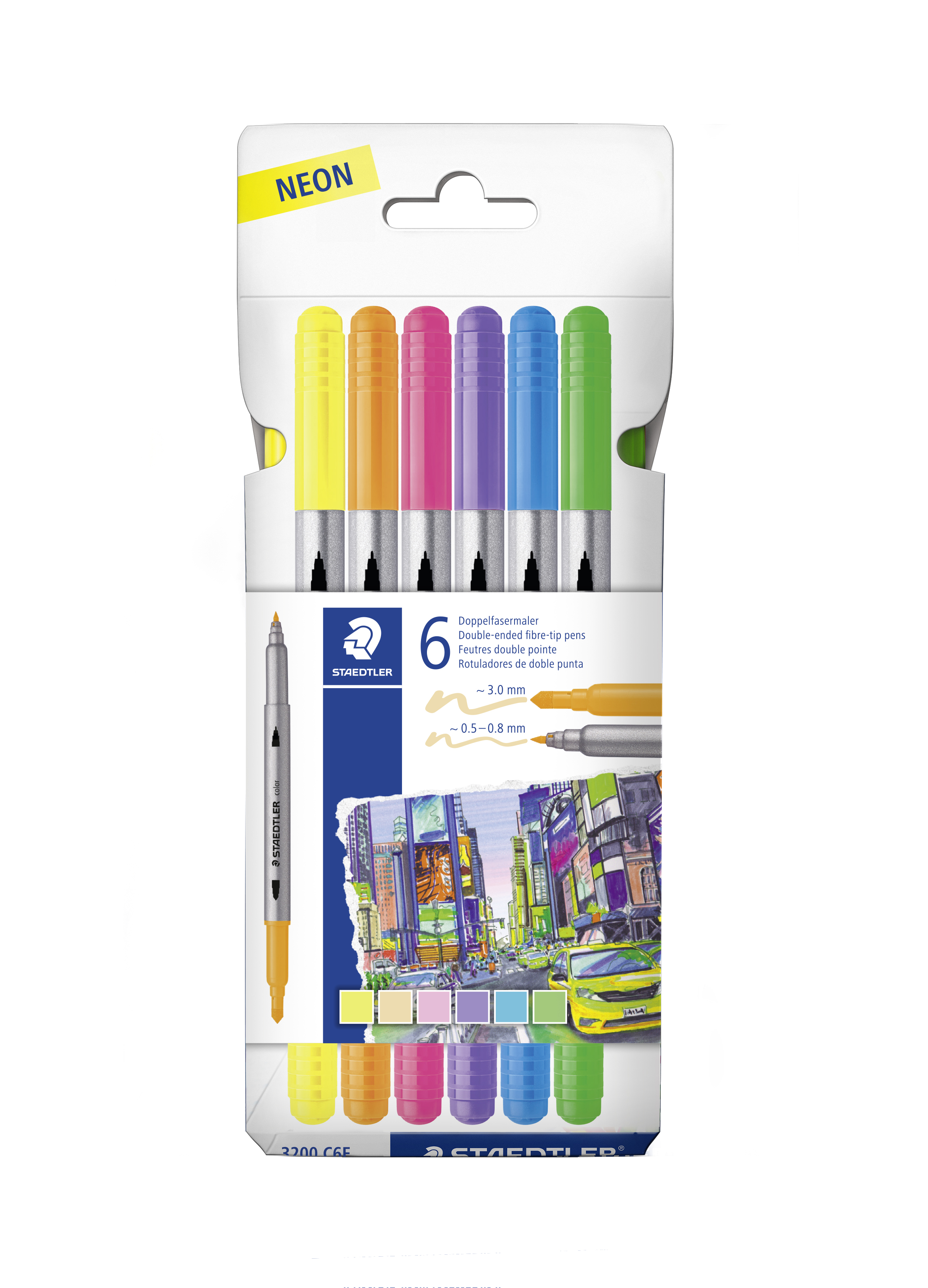 STAEDTLER® 3200 duo-tusser. •Én pen med to spidser. •Perfekt til smalle og brede streger når du tegner, illustrerer og farvelægger. •Høj farveintensitet. •Stregbredde hhv. bred ~ 3 mm og fin ~ 0.5 – 0.8 mm •Seje neon farver. Æske med 6 stk.
