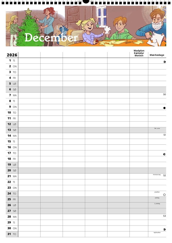 Kalenderen er opdelt i fem kolonner, én for hvert familiemedlem, og giver god plads til at notere aftaler, opgaver og begivenheder. Den er designet med fokus på funktionalitet og overskuelighed, hvilket gør det nemt at holde styr på alles planer.