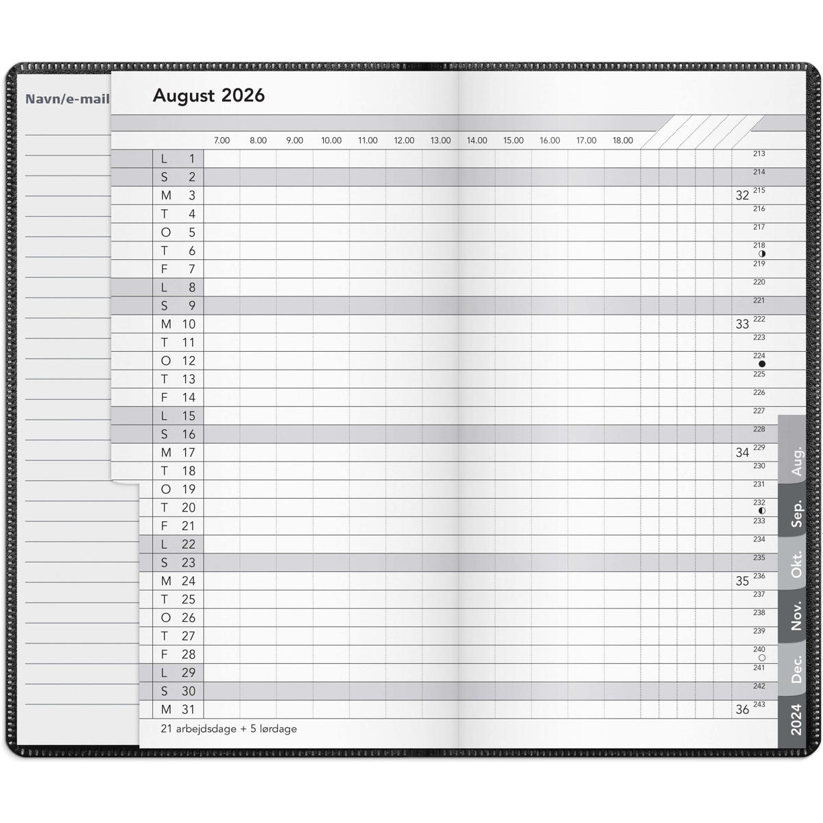 En stilren og enkel månedskalender i sort design, perfekt til at få overblik over hele måneden med et opslag.