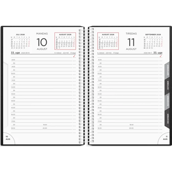 Denne spiralbundne dagkalender giver dig én dag pr. side med timeinddeling fra kl. 8–18, ideel til detaljeret planlægning. Med et kompakt format og et stilrent sort omslag er den både praktisk og æstetisk. Kalenderen indeholder også en årsoversigt, månedsoversigter og praktisk information