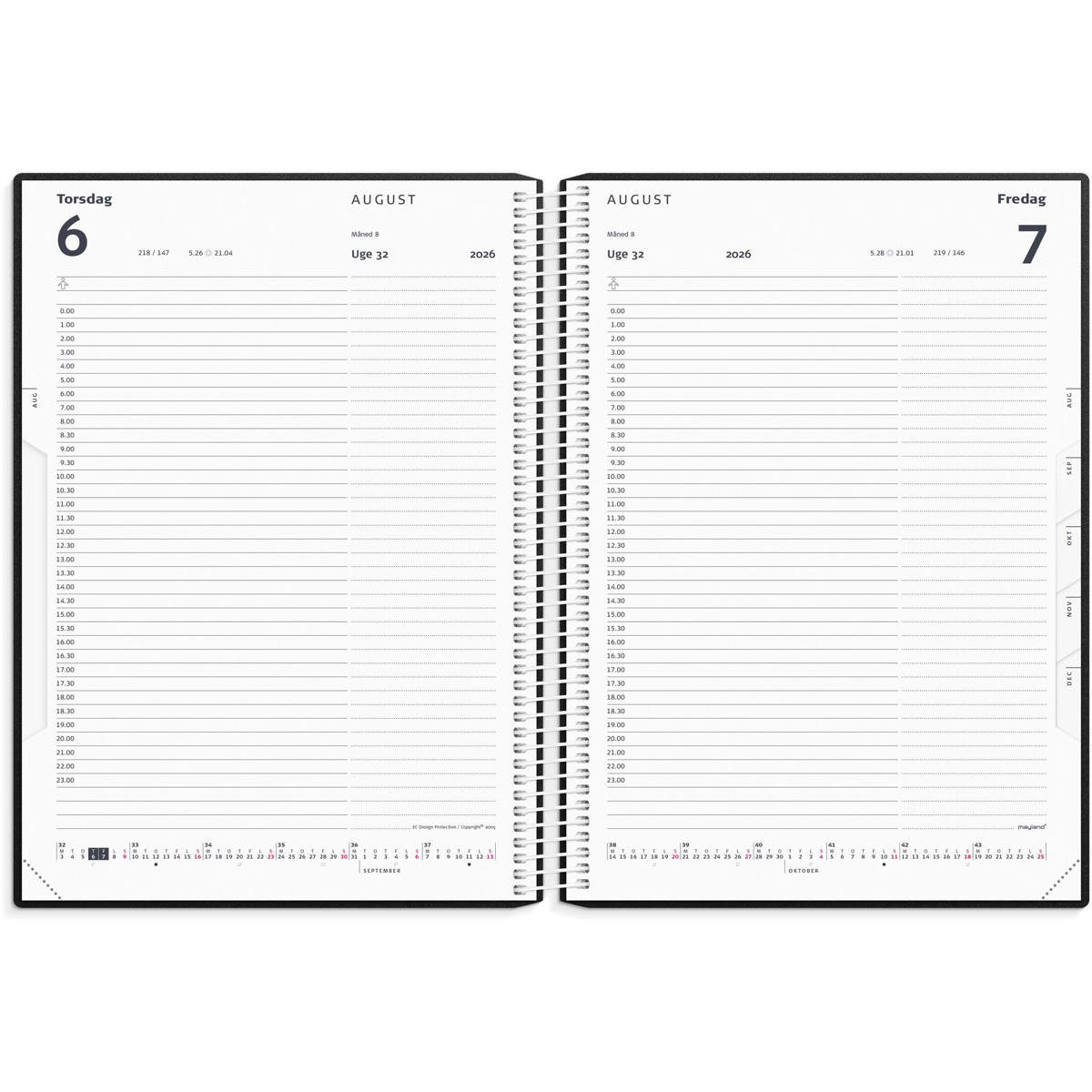 Denne spiralbundne timekalender i rød PP-plast giver én dag pr. side med timeinddeling fra kl. 00–23 og halve timer fra kl. 8–19, hvilket giver dig mulighed for at planlægge hele døgnet. Kalenderen indeholder også en tidslinje, månedsoversigt, udfoldelig årsoversigt, månedsregister, hjørneperforering og en praktisk noteringskolonne.