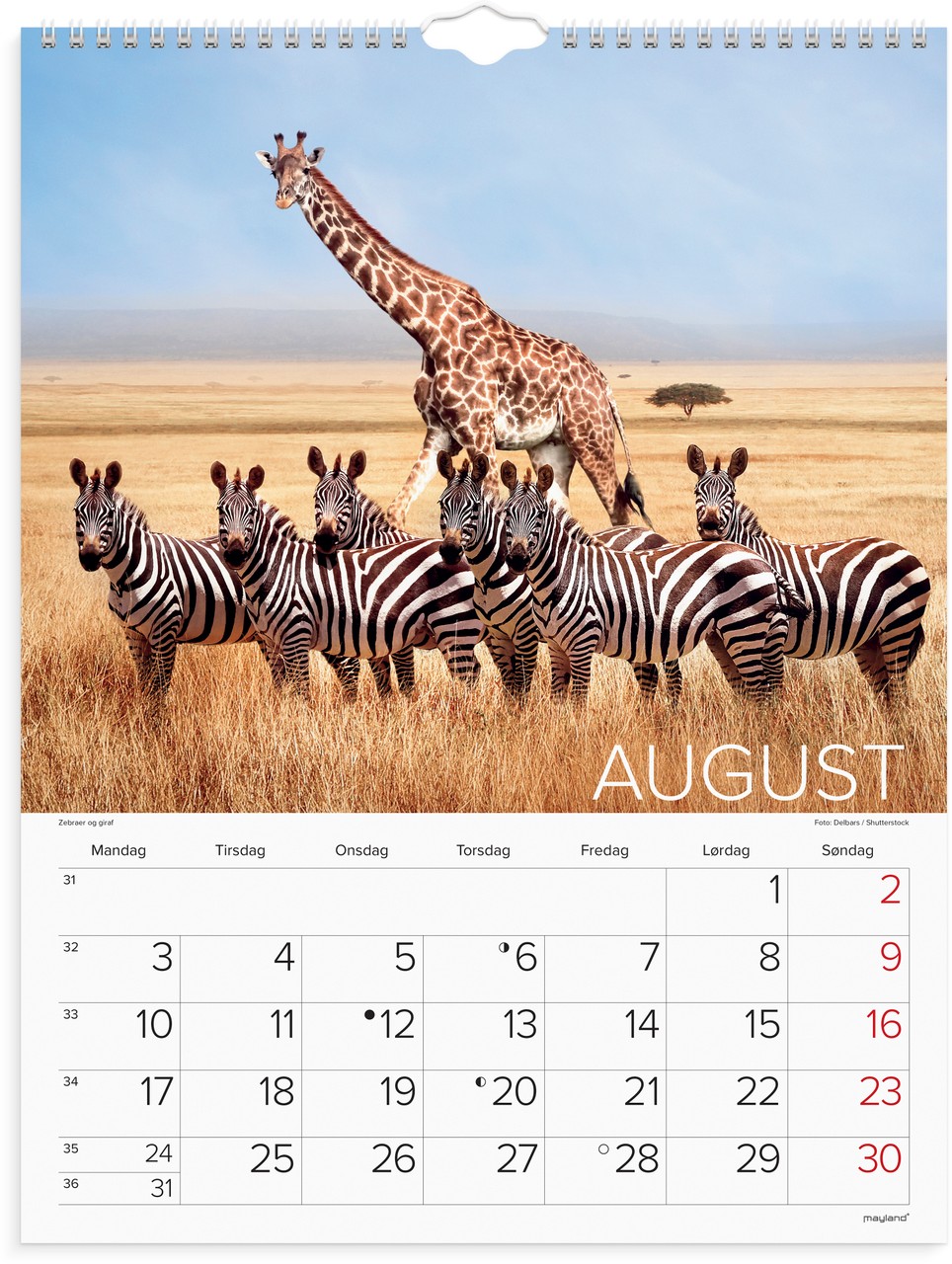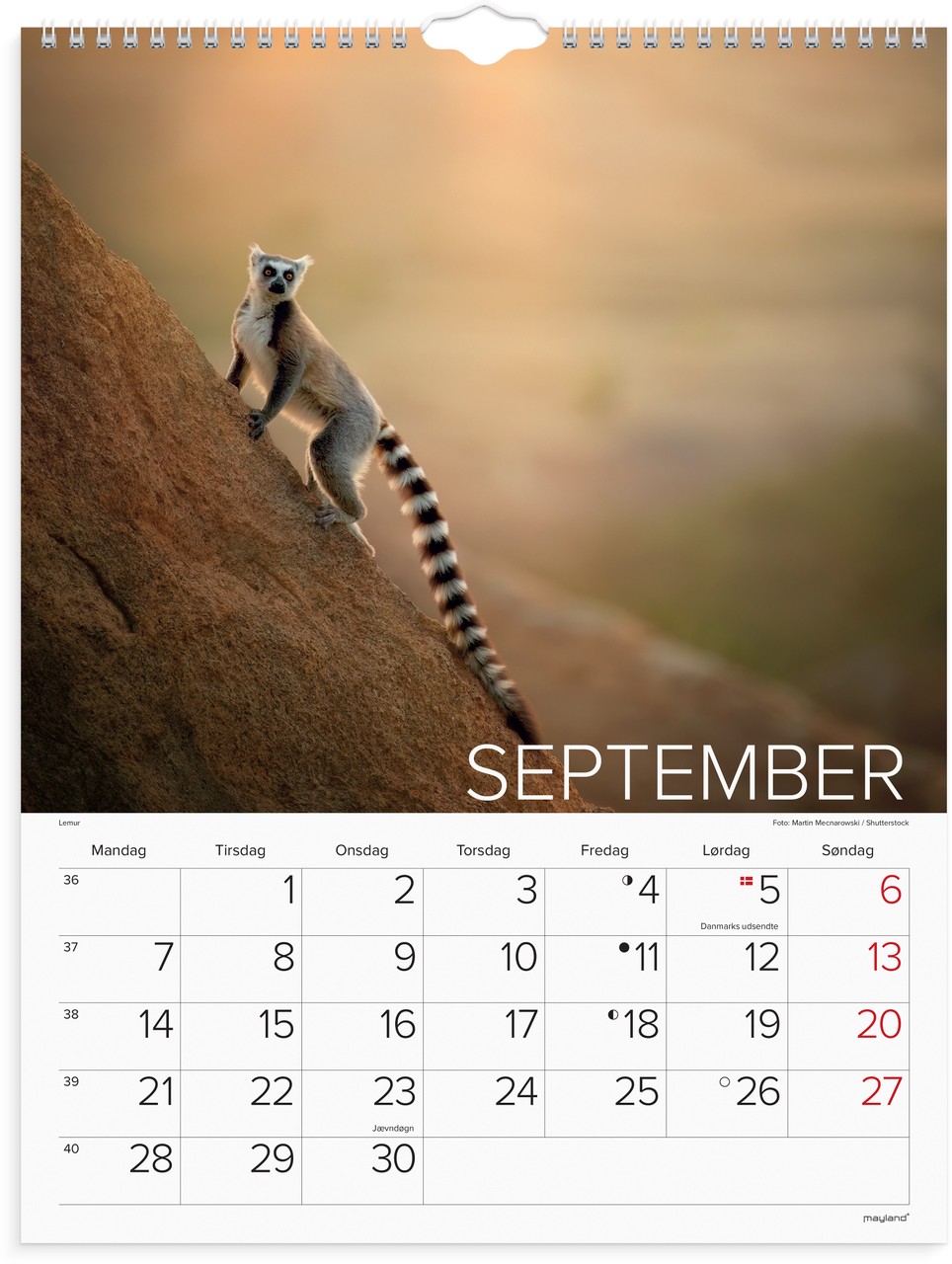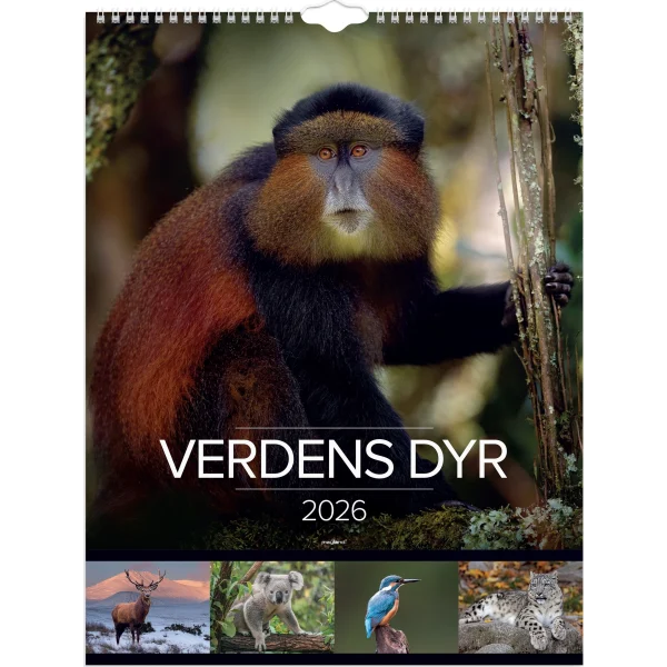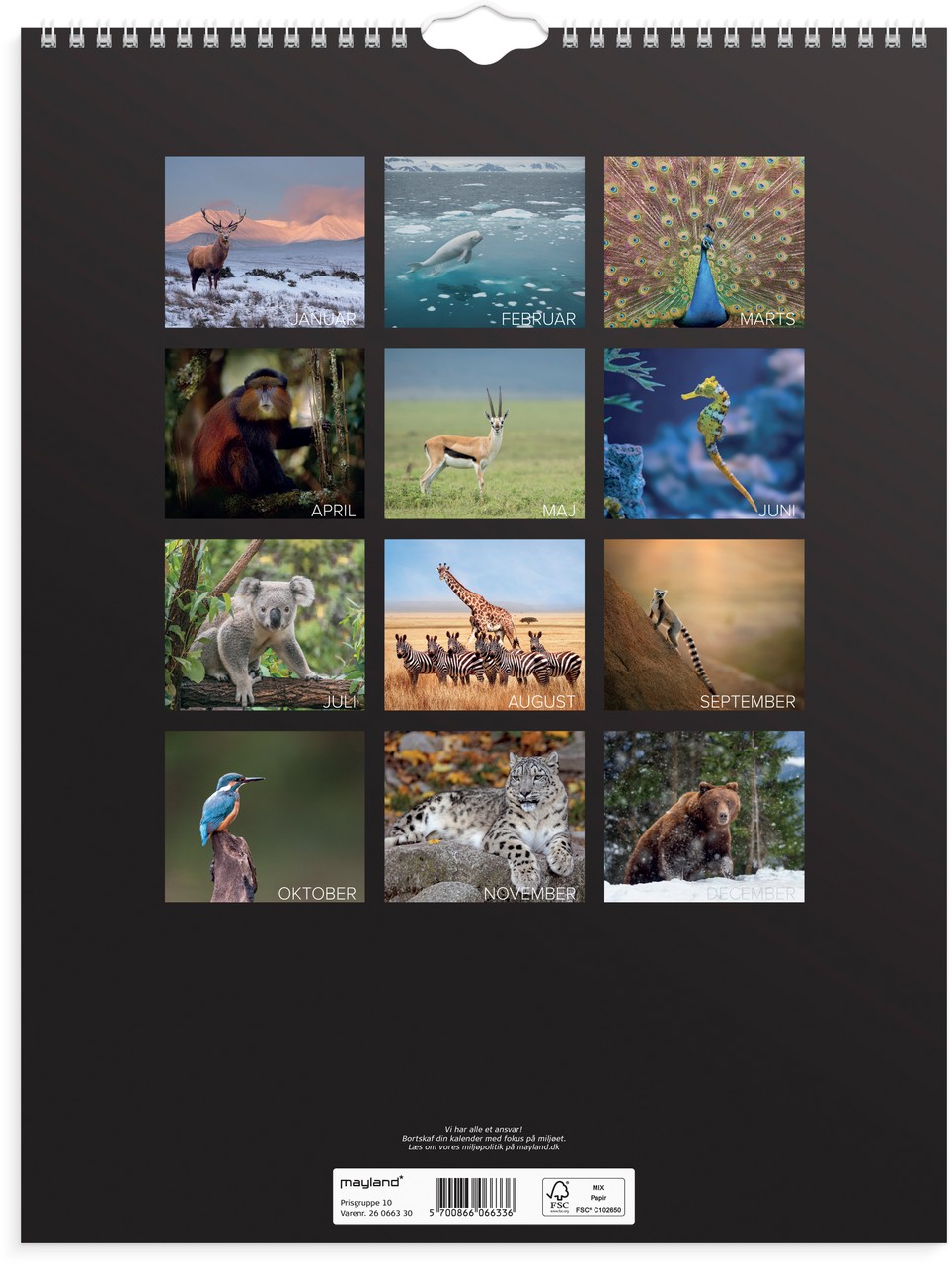 Vægkalender i karton med flotte billeder af verdens dyr.