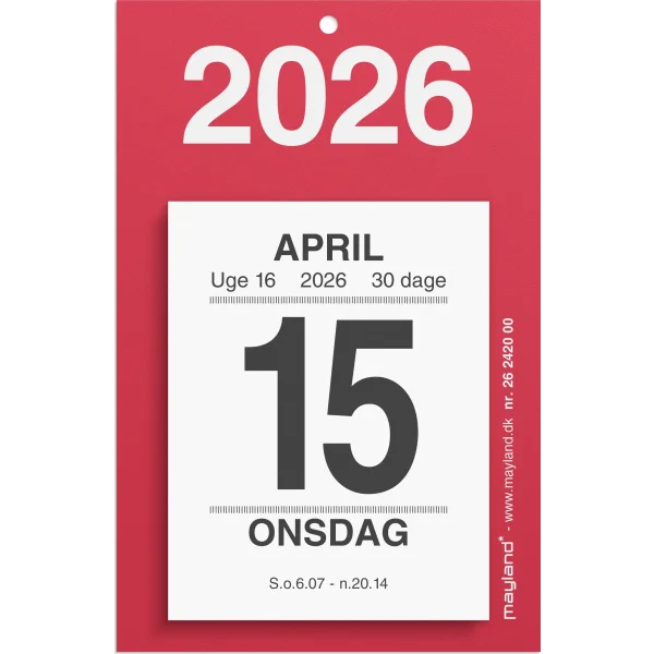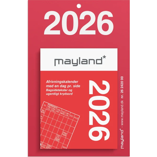 Den smarte, lille vægkalender har et praktisk blokformat, hvor hver side nemt kan rives af blokken, når dagen er gået. Afrivningskalenderen har et enkelt og moderne design med en rød baggrund og har bagsidetekster og et ugentligt krydsord.