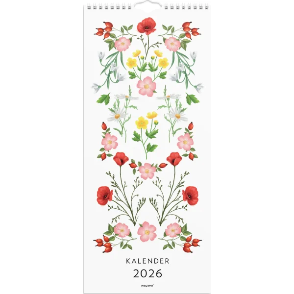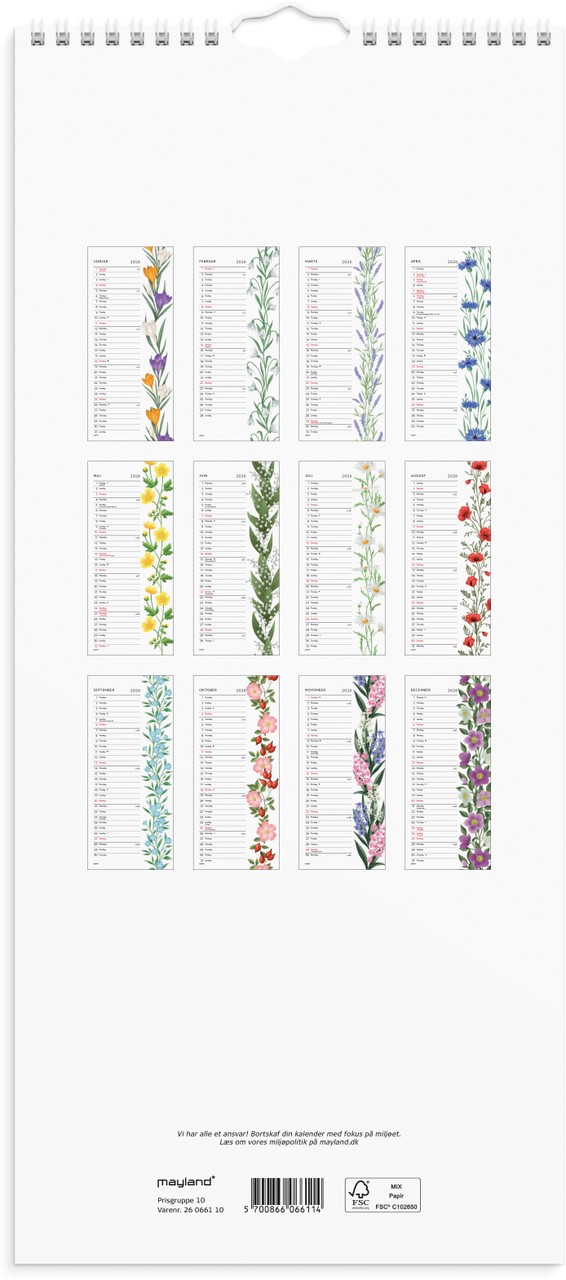 Dekorativ vægkalender i karton til vægophæng. Kalenderen er spiralindbundet og har smukke blomsterillustrationer.