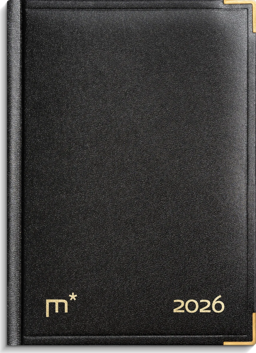 Årbog med mærkebånd og månedsfaner. Kalenderen er indbundet med et omslag kunstskind med fine, messinghjørner, som giver kalenderen et flot og elegant udseende.