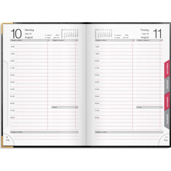 Kalenderen er inddelt med en dag pr. side og indeholder et timeopdelt kalenderskema fra kl. 8-18, så du nemt kan danne dig et overblik over dagens planer og aktiviteter.