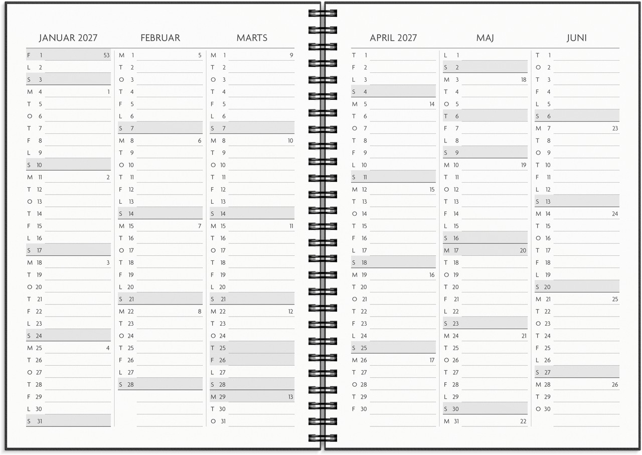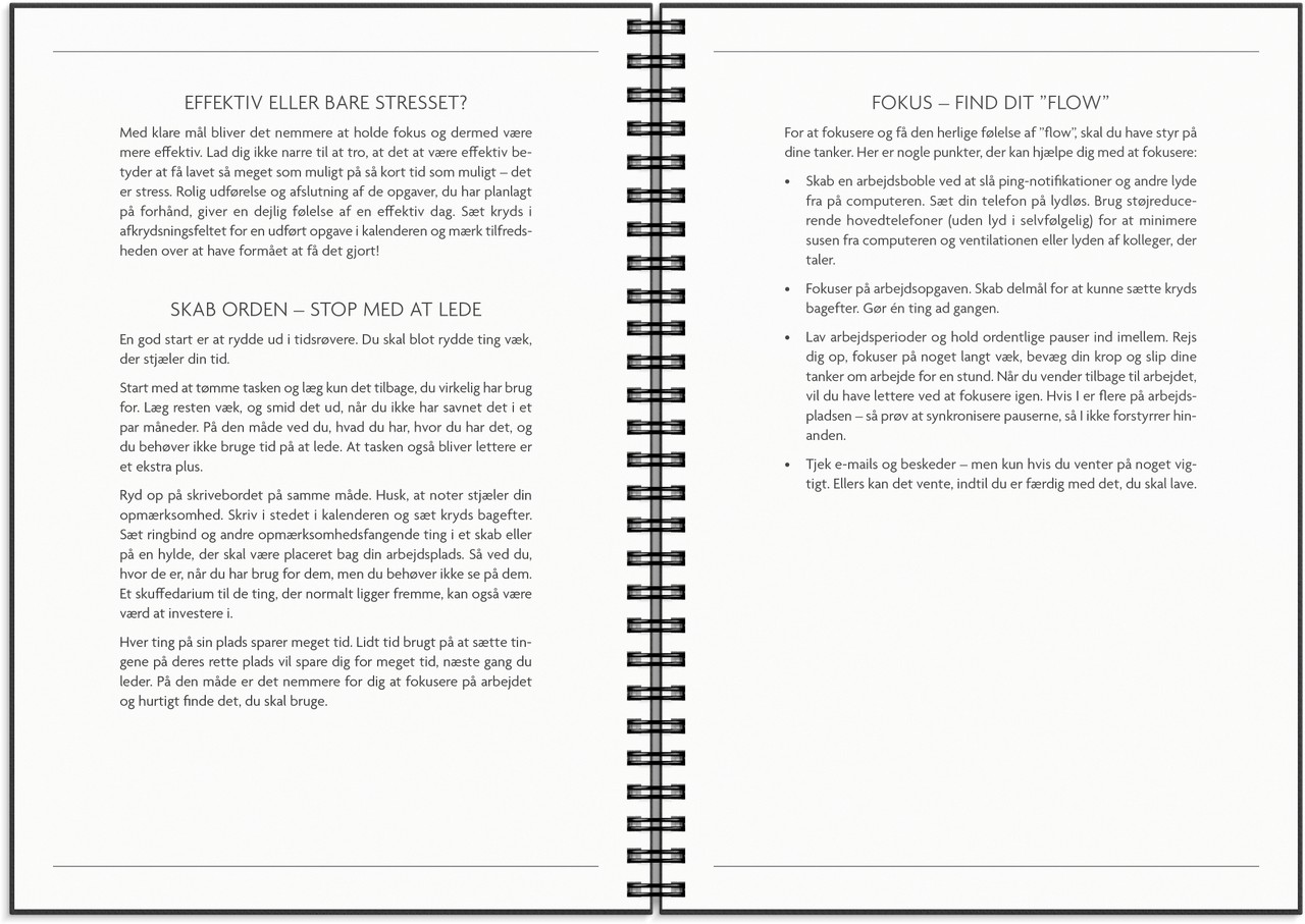 Desuden har kalenderen en lomme til løse papirer, et adresse- og telefonregister samt notatsider, så du har mulighed for at skrive længere tekster. Alt sammen elementer, der hjælper dig med at være mere effektiv.