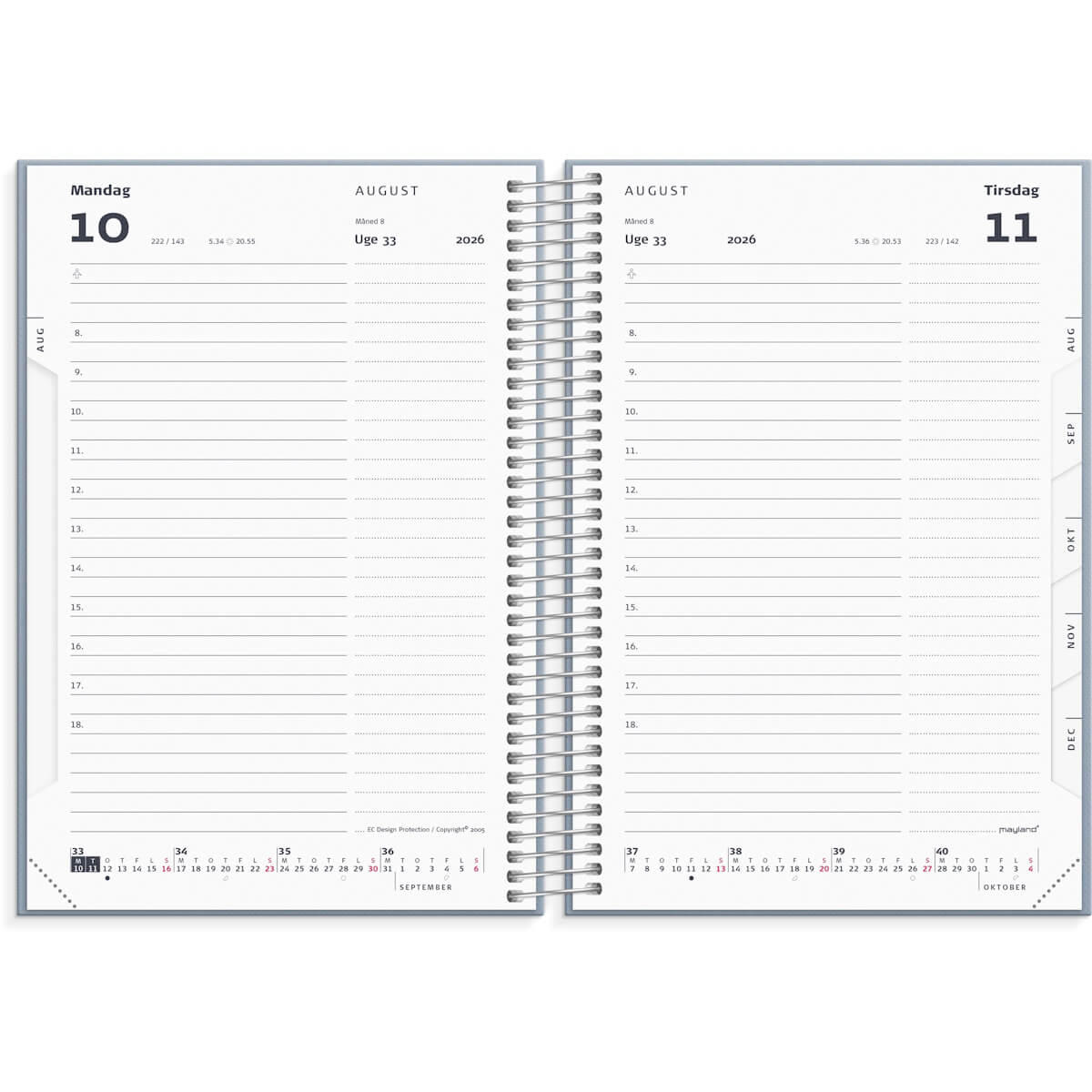 Kalenderen er inddelt med en dag pr. side og indeholder et timeopdelt kalenderskema fra kl. 8-18 i moderne layout, så du nemt kan danne dig et overblik over dagens planer og aftaler.