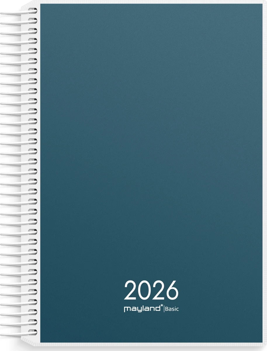 Simpel dagskalender i et enkelt design. Kalenderen er spiralbundet med et omslag i PP-plast og har en grå forside med årstal.
