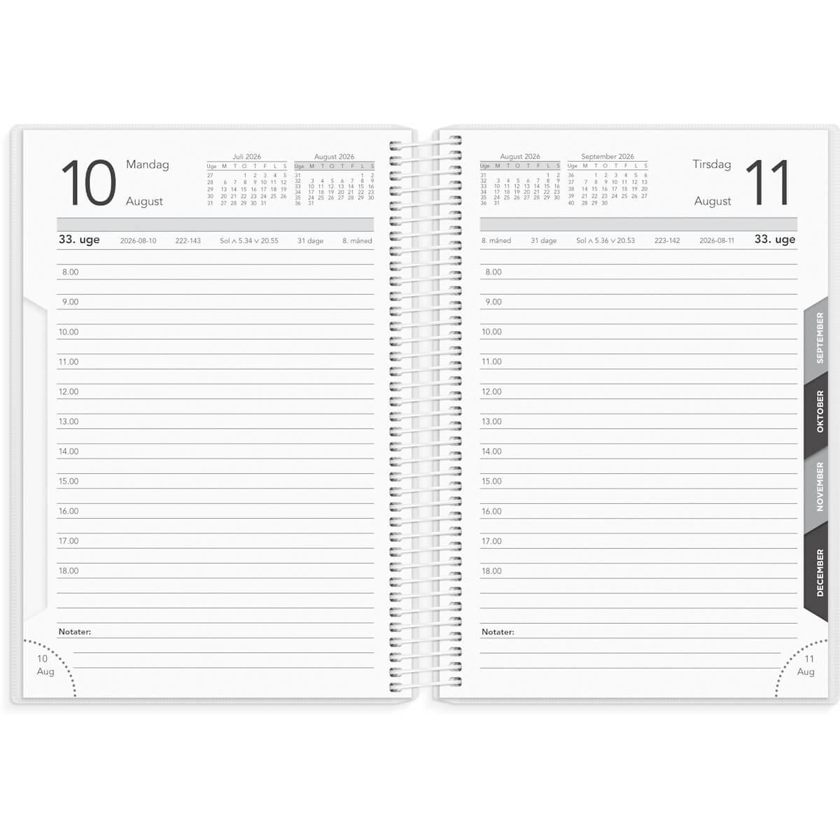 Dertil finder du plads til dagens noter nederst på hver side, en månedsoversigt ved hver måneds start samt afrivningshjørner, så du hurtigt og nemt kan slå op på dagens side.