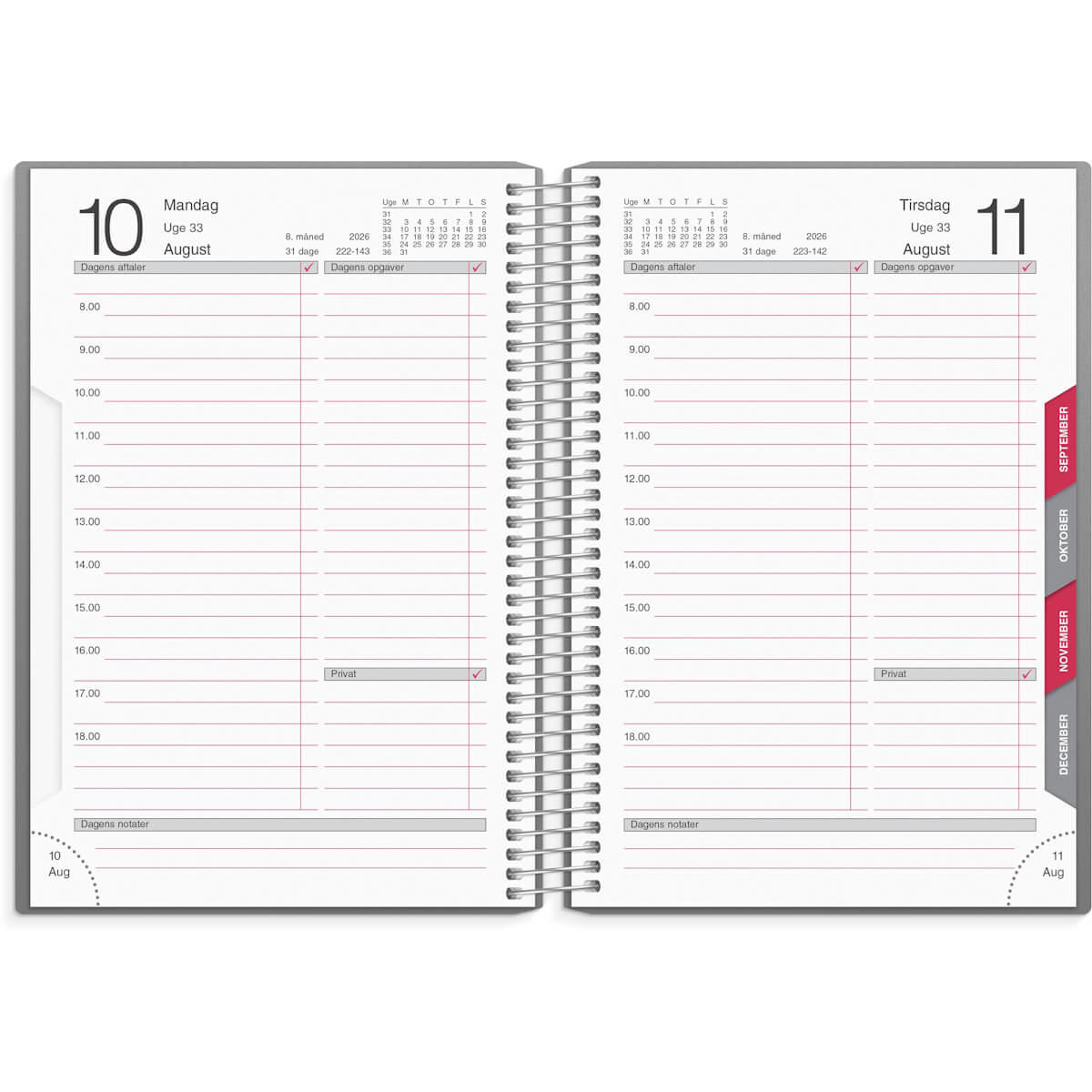 Struktureret dagskalender. Kalenderen er spiralbundet med et omslag i hård PP-plast, som giver kalenderen et enkelt udseende.