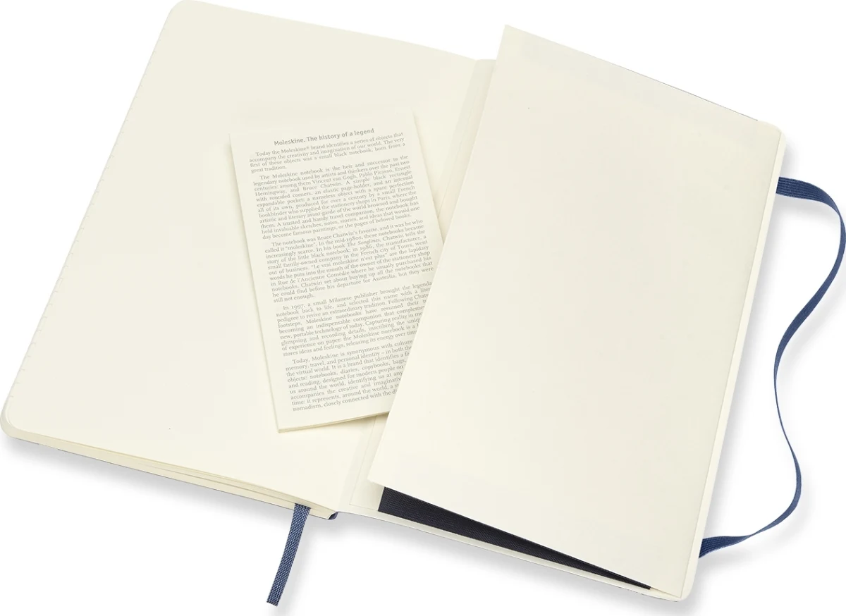Moleskine Soft Notesbog er en elegant og funktionel notesbog, velegnet til daglige noter, idéer og planlægning. Det bløde, fleksible omslag i blå giver et moderne udtryk og gør notesbogen behagelig at bruge – både hjemme, på kontoret og på farten.