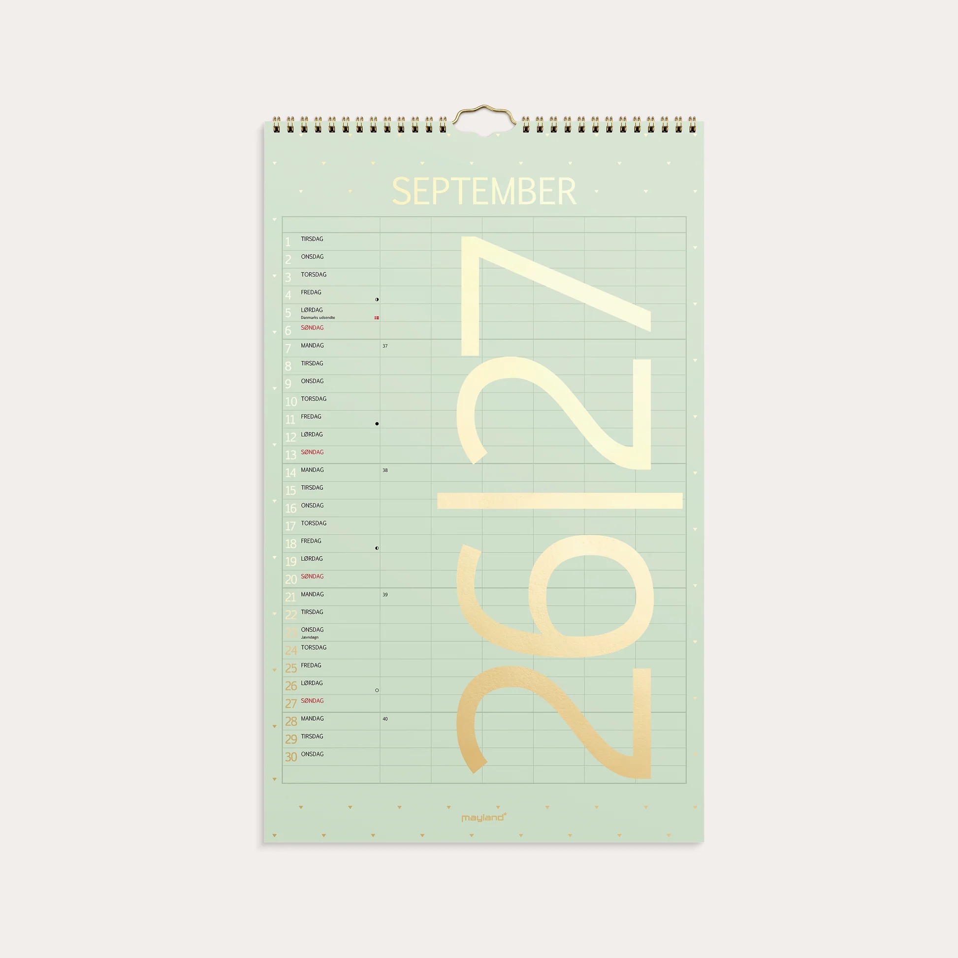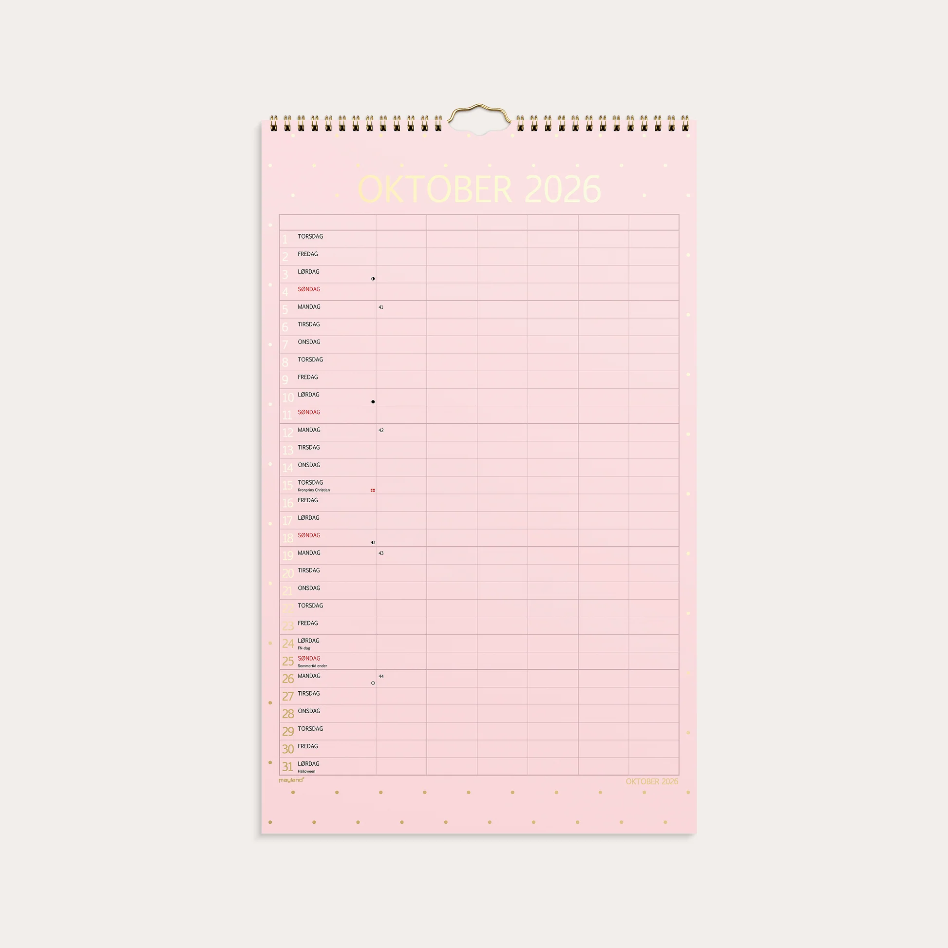 Familiekalender, der følger studieåret, i praktisk og elegant design med skiftende farver.