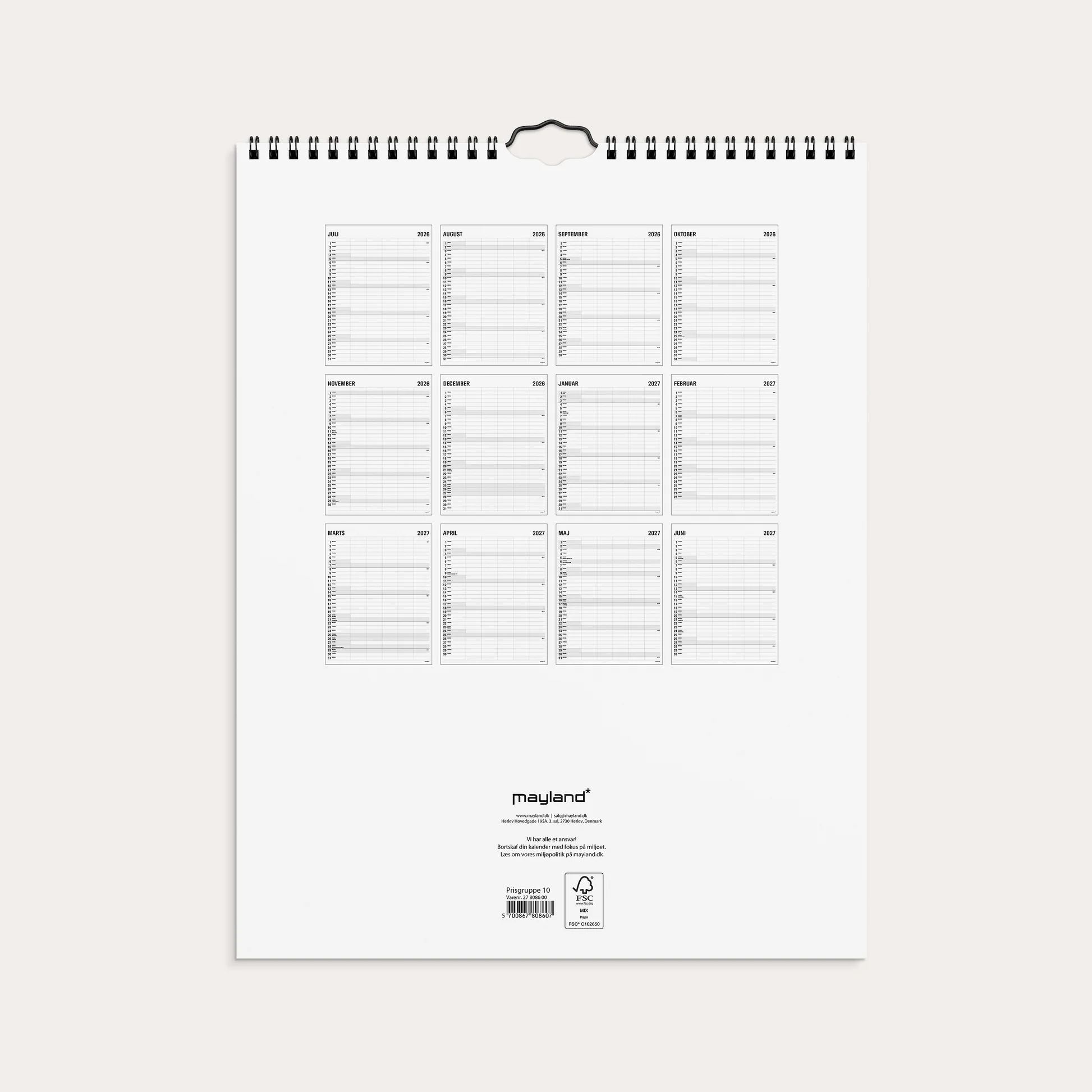 Familiekalender i sort/hvidt, stilrent design, som følger skoleåret.