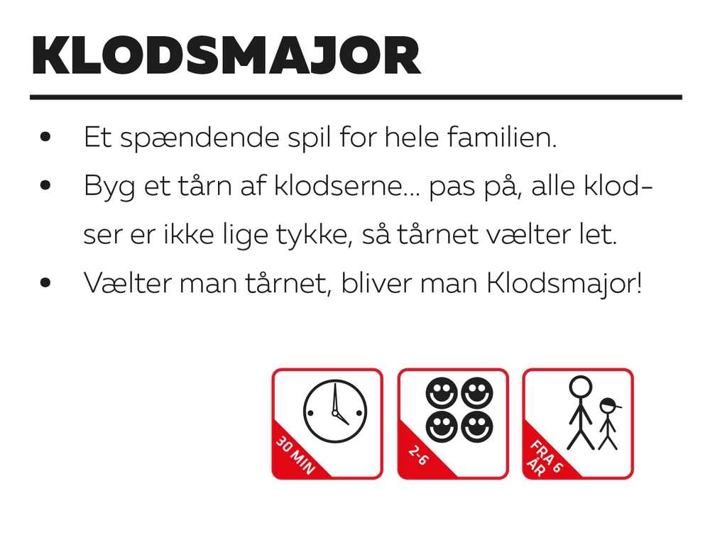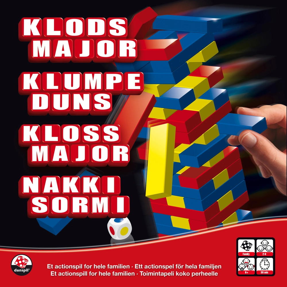 Få klar besked: det her er ikke fisk og brætspil, det er nervevridende familieunderholdning i højeste balanceklasse. Tårnet bygges i farverne rød, blå og gul – lag efter lag, indtil det krængende kæmpe står klar. Så gælder det om at fjerne klodser med præcision og lægge dem på toppen – én efter én – uden at alt vælter. Og falder det, råber alle “KLODSMAJOR”!